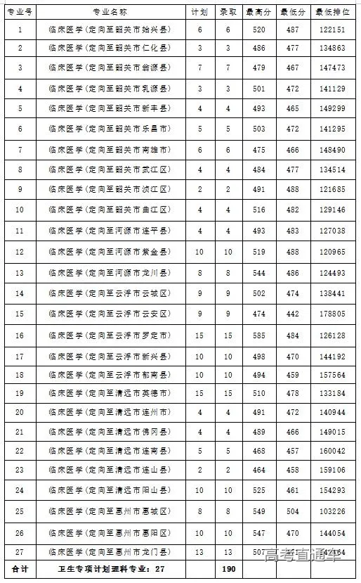 截至8月12日,依据《关于做好2020年广东省夏季普通高校招生录取工作的通知》(粤招办普【2020】32号)投档原则,经广东省教育考试院审核,我校完成广东省本科提前批次卫生专项计划招生录取工作。共录取临床医学190人,具体录取情况见下表,具体录取名单及专业请登录韶关学院招生信息网“录取查询”查询http://zs.sgu.edu.cn/query/lq.aspx。