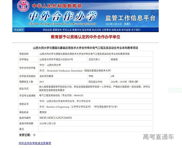 12月31日,教育部公布2025年下半年予以认定的中外合作办学项目,我校与德国北豪森应用技术大学合作举办的电气工程及其自动化专业本科教育项目正式获批,成为继太原理工大学2个中外合作办学项目之后,山西省获批的第3个本科院校中外合作办学项目,标志着我校国际化办学迈入新阶段。