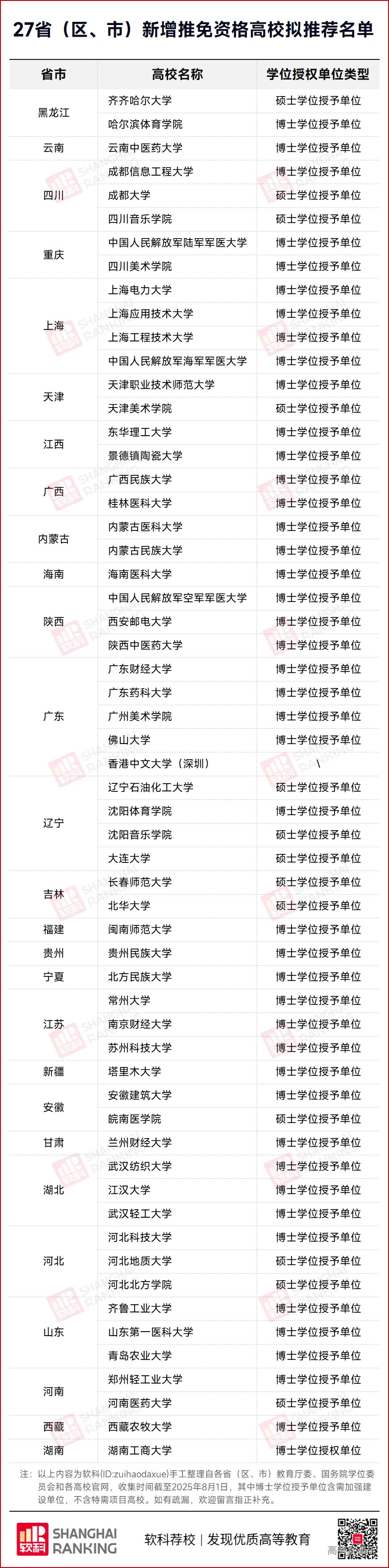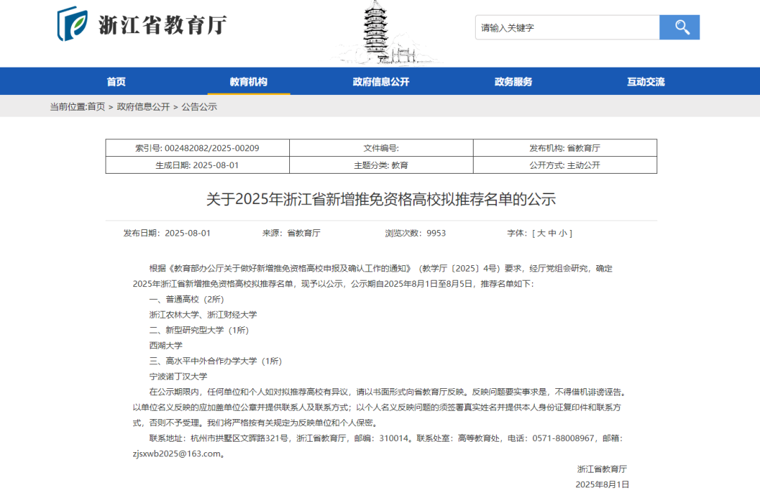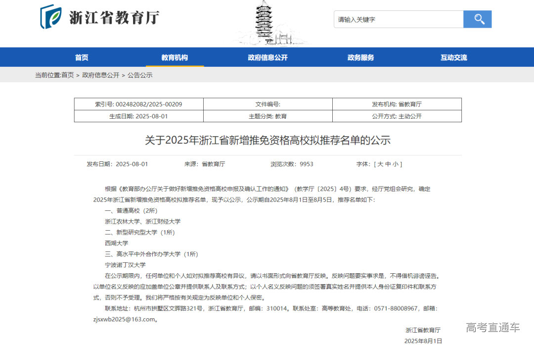 8月1日,浙江省教育厅发布《关于2025年浙江省新增推免资格高校拟推荐名单的公示》。