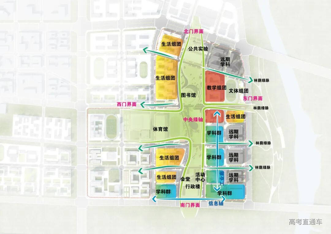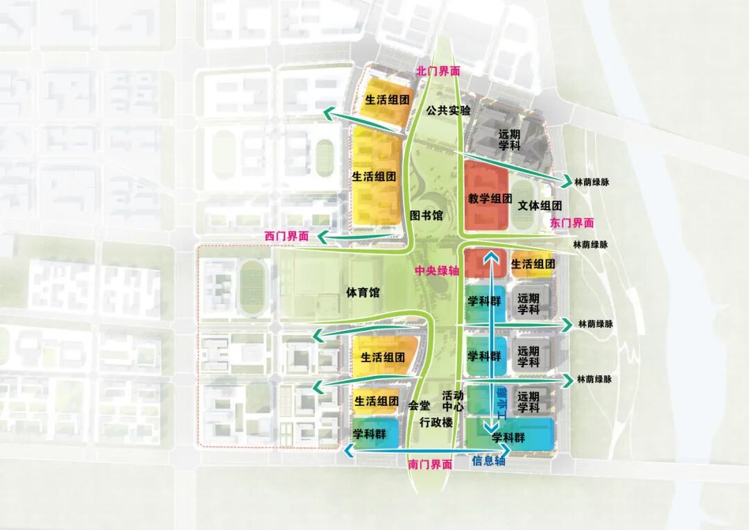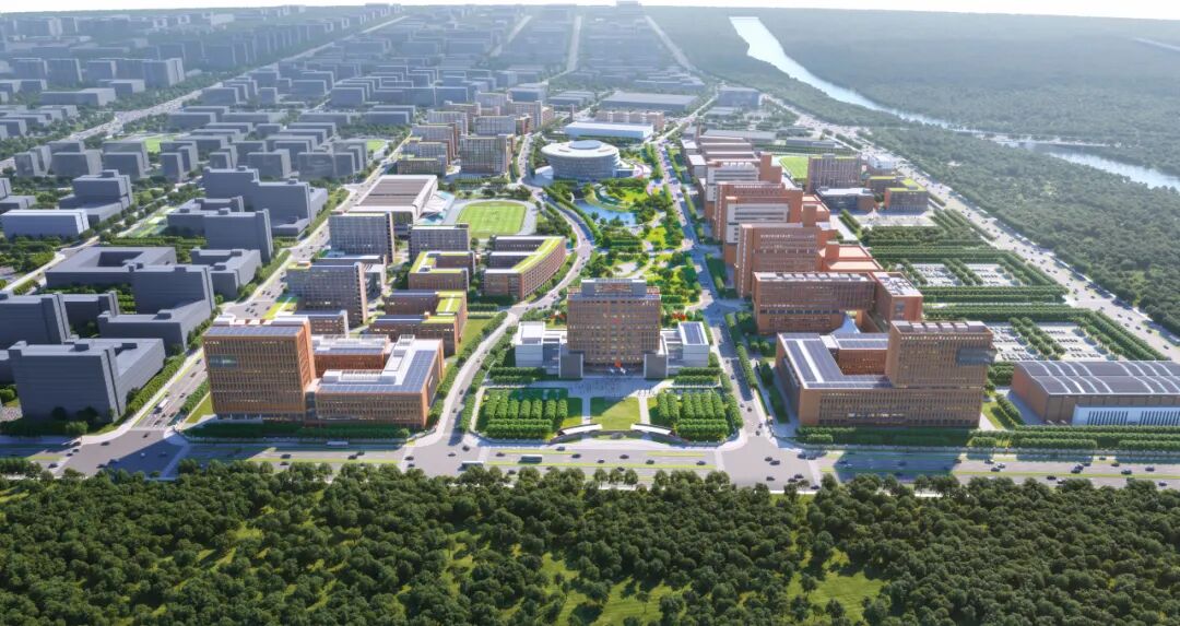 项目以“十字联城,轴带共长,化直为曲,合理布局”为设计理念,从“联城、绿脊、构园、延脉、弹性、匠韵、碳汇”七个维度思考生态为基、人文为本、创新为魂的未来校园新模式, 致力于实现“城市窗口”与“生态绿肺”双效合一,打造国际化学术高地,构筑友好式活力校园,树立智慧化生态典范。