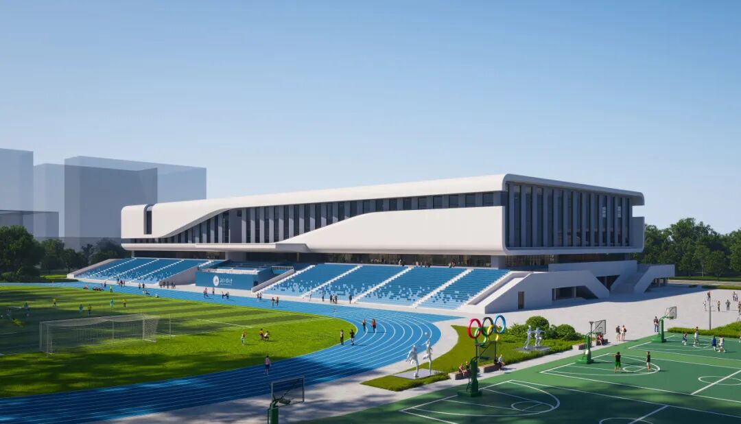 体育馆位于校园西侧主入口,方正体量可满足比赛馆、训练馆、多功能馆、游泳馆等一专多能的使用需求。简洁流畅的曲线造型象征着“活力枢纽”,构建了校园标志性活力空间。