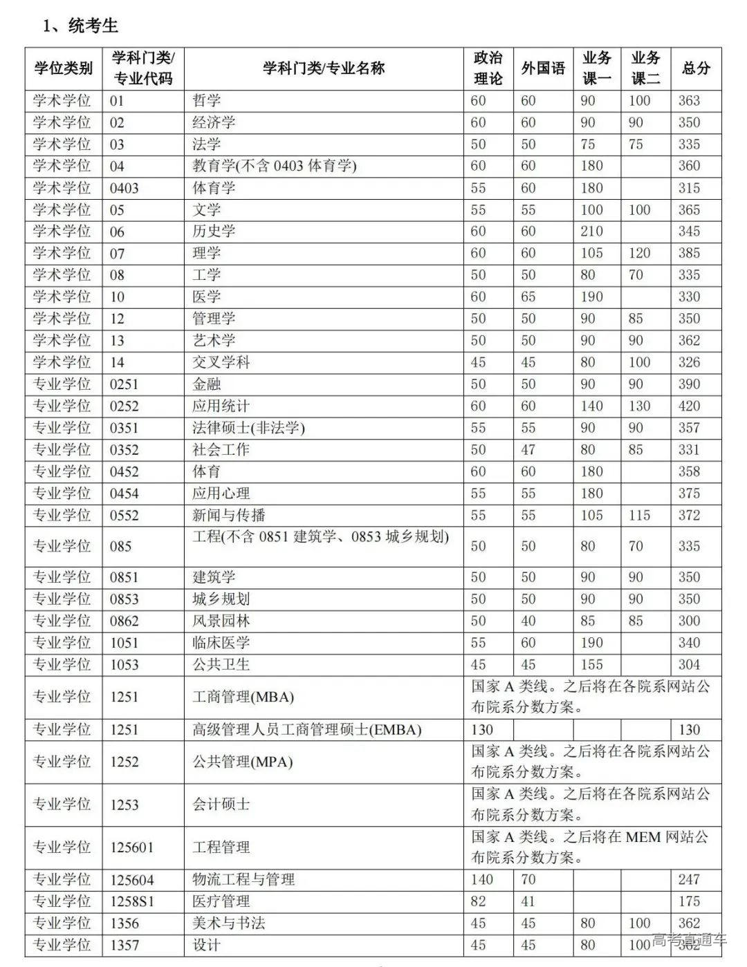 同时满足政治理论成绩不低于40分;外国语成绩不低于60分;业务课一成绩不低于52分;业务课二成绩不低于80分;总分不低于288分。 01 “强军计划”:同时满足政治理论成绩不低于40分;外国语成绩不低于40分;业务课一成绩不低于80分;业务课二成绩不低于70分;总分不低于280分。 02 “少数民族高层次骨干人才计划”(不含新疆MPA项目):按照所报考院系(专业/研究方向)的复试分数线,总分线降10分,单科线不降。 03 “少数民族高层次骨干人才计划”(新疆MPA项目):同时满足满分100分科目单科成绩不低于50分;满分200分科目单科成绩不低于100分;总分不低于175分。 04 “退役大学生士兵专项硕士研究生招生计划”:按照所报考院系(专业/研究方向)的复试分数线,总分线降10分,单科线不降。“退役大学生士兵专项硕士研究生招生计划”考生允许调剂到普通计划,需调剂的考生必须在所报考院系专业复试之前联系报考院系提交调剂申请。 05 考生须达到院系面向各类专项计划确定的学科、专业/研究方向的复试基本要求才能进入复试。 “大学生志愿服务西部计划”“三支一扶计划”“农村义务教育阶段学校教师特设岗位计划”“赴国外汉语教师志愿者”“选聘高校毕业生到村任职”“高校学生应征入伍服现役退役”等项目服务考生,须在中国研招网报名时按要求填报相关信息,按照教育部当年度硕士研究生招生录取工作的相关规定享受加分政策。未按规定申报的,不享受相应加分政策。已按要求申请的考生,须在招生院系复试前向招生院系提交相关证明材料。其中拟录取享受“大学生志愿服务西部计划”等政策的考生提交的证明材料需包括《大学生志愿服务西部计划志愿服务证》、《志愿服务鉴定书》和服务单位证明等材料复印件。 “退役大学生士兵专项硕士研究生招生计划”考生需提交《入伍批准书》和《退出现役证》复印件。该计划考生允许调剂到普通计划,需调剂的考生还需提交调剂申请。 “少数民族高层次骨干人才计划”考生需提交《少数民族高层次骨干人才计划考生登记表》。 符合条件并申请享受照顾少数民族照顾政策的考生(指工作单位和户籍在国务院公布的民族区域自治地方,且定向就业回原单位的少数民族在职人员统考考生),须在中国研招网上报名时按要求填报相关信息,并如实填写少数民族身份及定向就业少数民族地区。未按规定申报的,不享受相应照顾政策。已按要求申请的考生,还须在招生院系复试前向招生院系提交相关证明材料。经审核满足享受照顾少数民族照顾政策的考生,按照所报考院系(专业/研究方向)复试分数线,总分线降10分,单科线不降。 以上材料均需登录清华大学研究生申请服务系统(https://yzbm.tsinghua.edu.cn/ndLogin)后,按照相关要求提交。 以上各类照顾政策不重复或累加享受。 各院系将根据本学科、专业特点以及生源和招生计划数,制定不低于学校招生复试基本分数线的院系学科(专业/研究方向)复试分数线,并以此确定入围复试考生名单。 相关复试工作安排另行通知。 清华大学研究生招生办公室 2024年3月12日