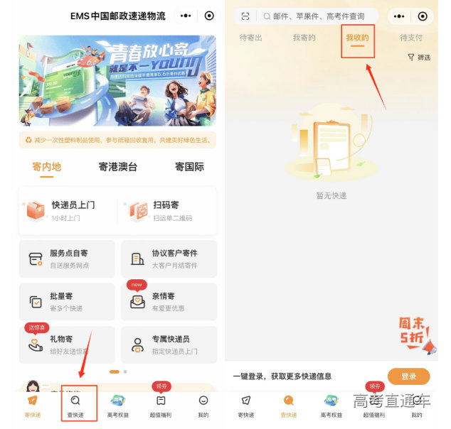 第三步:在“查快递”选项中的“我收的”页面处,即可查到录取通知书的;