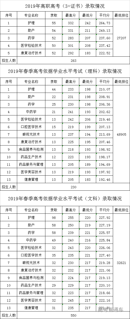 惠州卫生职业技术学院2019年依据学业水平考试和3+证书录取分数线