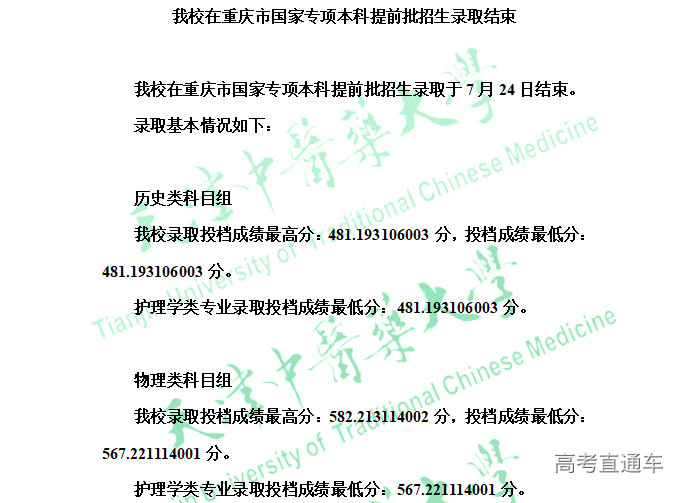天津中医药大学2024年重庆市国家专项本科提前批招生录取情况