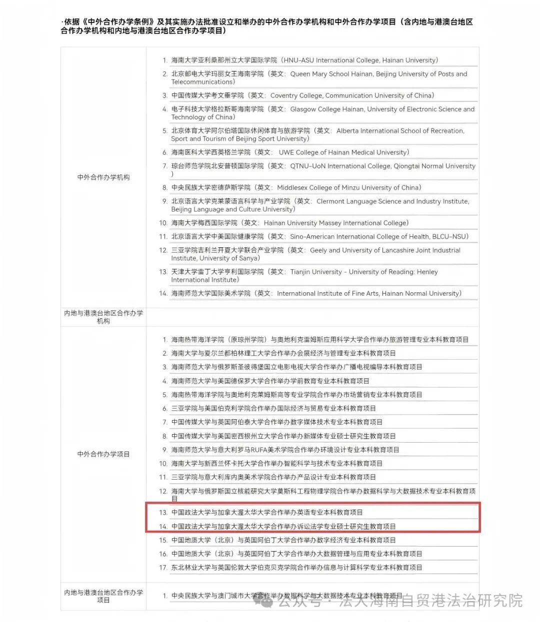 近日,新一批中外合作办学机构(项目)获教育部审批通过,我校与加拿大渥太华大学合作举办英语专业本科教育项目、诉讼法学专业硕士研究生教育项目获批在海南陵水黎安国际教育创新试验区办学,这是我校海南国际学院首批获批的中外合作办学项目,标志着学校在异地开展国际教育平台构建和优质教育资源合作方面取得“开门红”。