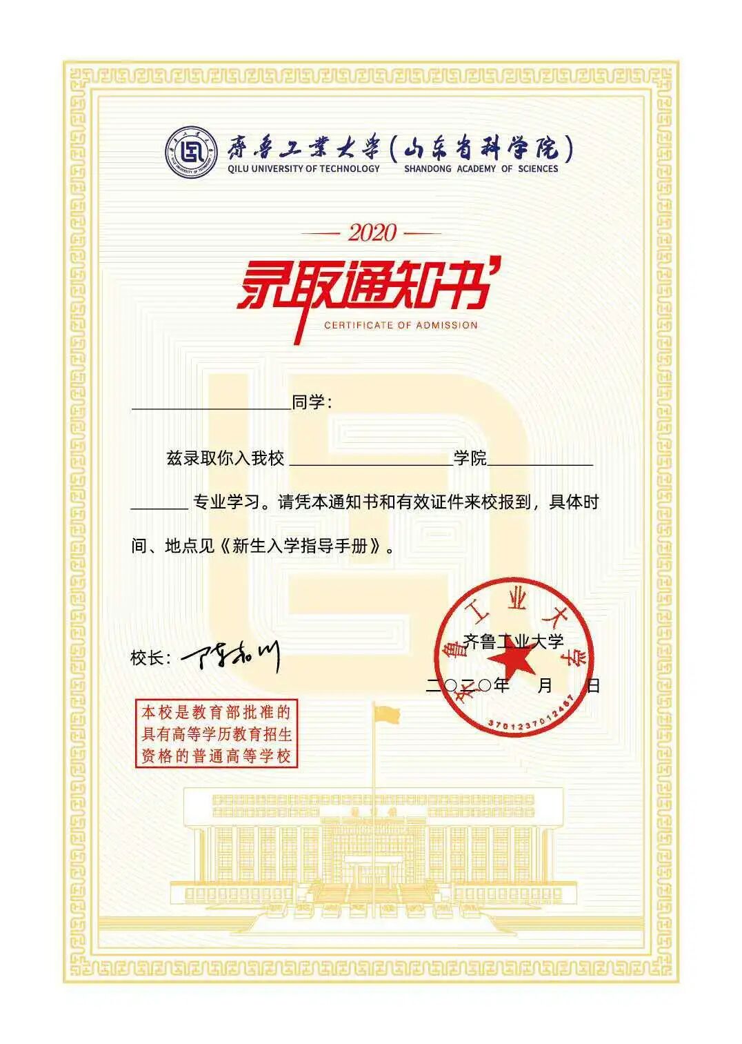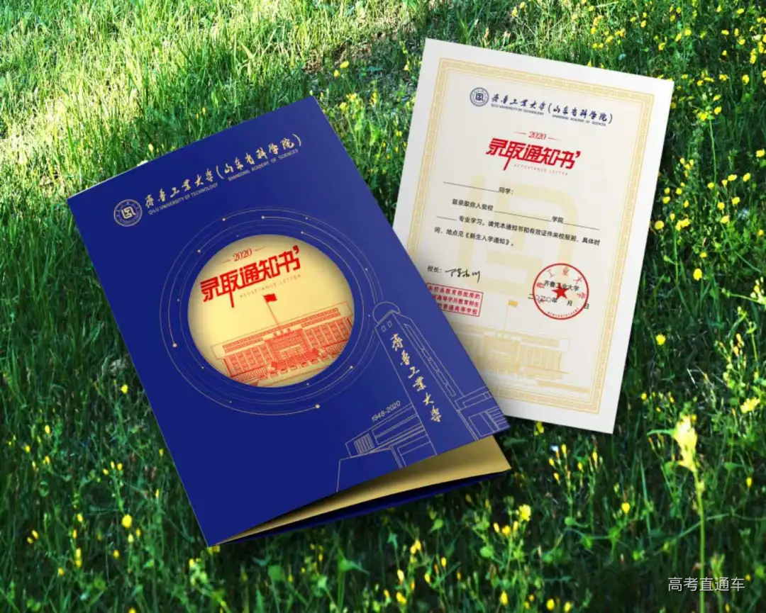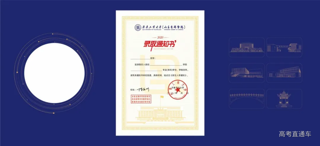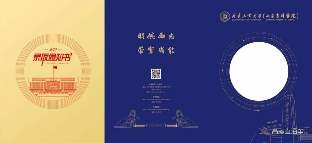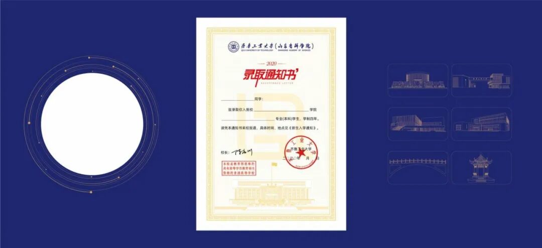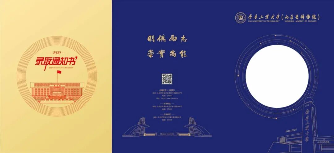 加入星光之海 录取通知书的封面是齐鲁工大的标志蓝色。宽广而纯净,如宇宙浩瀚无垠。金黄色镂空图案的周围,一颗颗行星正在汇聚。那是同学们正走在一起,开启壮志凌云的征程。齐鲁工大让每一个梦想闪闪发光,愿你在自己的轨道上画出最美的光线。 打开梦想之门 通知书采用折页方式,两边打开,仿佛开启一道门。星空般深邃的内页上,展现着齐鲁工业大学六大标志性建筑,分别代表六个不同方面:科研强劲、学科精专、名师引航、携作共进、就业优质、环境美好。这是一道开启梦想的门。为你打开前进的路,助你踏上实现理想的征途。 树立浩然之志 明德励志,崇实尚能。良技以精工,壮志以报国。金色的校训写在通知书上,也写在每一位工大人的心里。踏入工大校门的学子,当胸怀宏图壮志,心系国家民族,今日练就摘星手,明朝踏浪九重天。 “新”聚工大 青春的际遇 正让我们同奋斗、共成长 把执着的梦想写在广阔的天空 “星”耀齐鲁 未来的你们 会让我们更骄傲、更自豪 把奋进的旋律唱遍光阴的轮回
