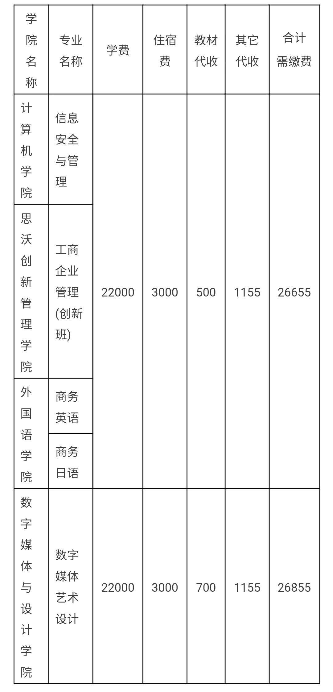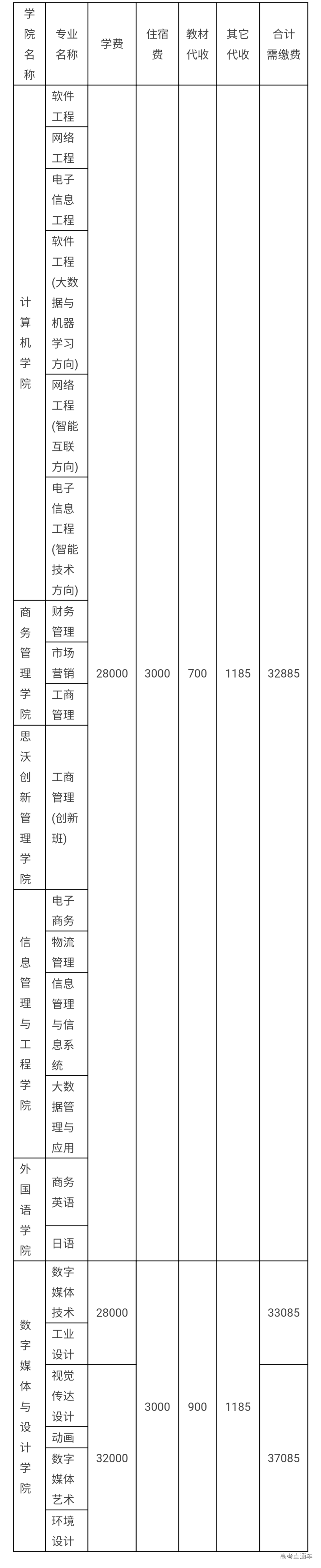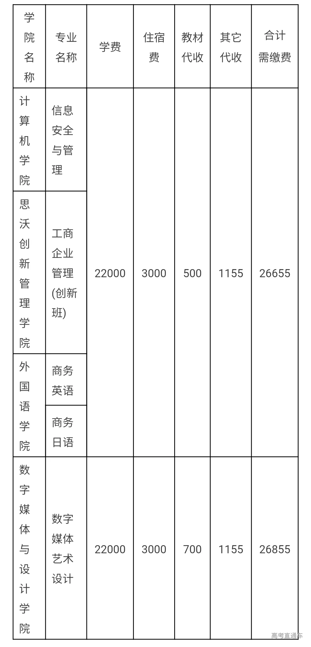 4.其它代收费:一次性收取。本科合计1185元,专科1155元,具体包括: