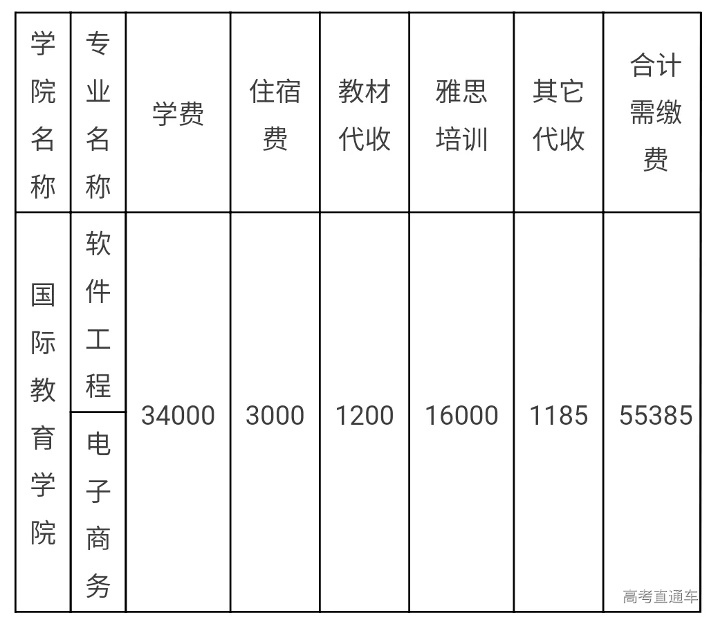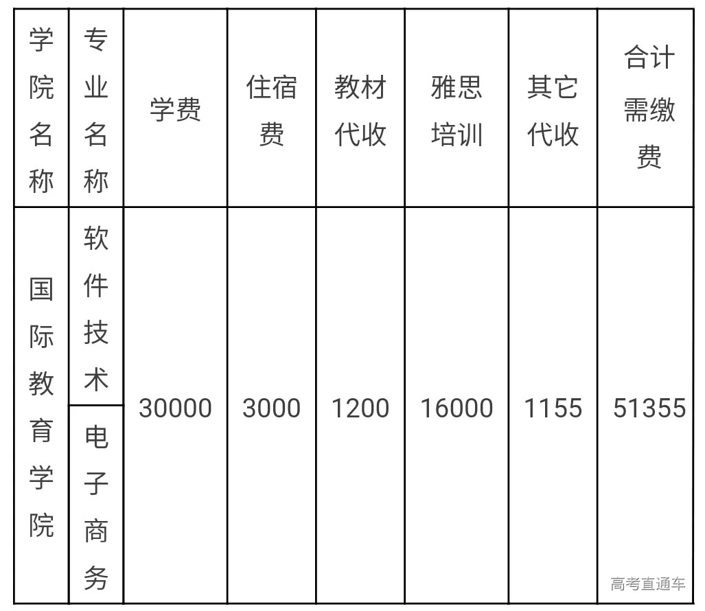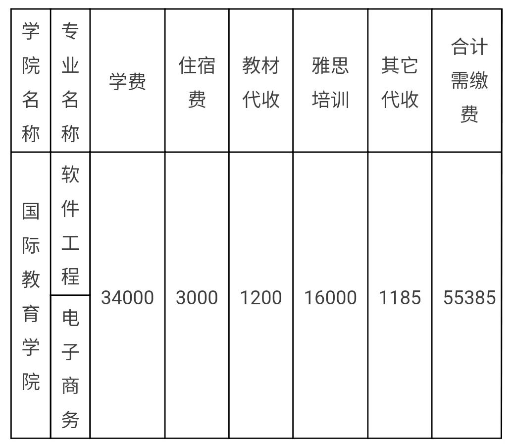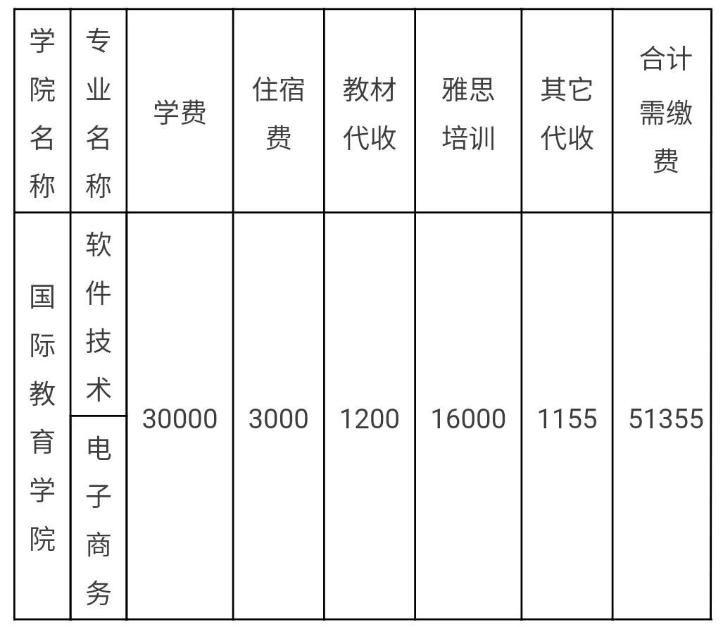 3.雅思培训代收费:国际教育学院学分互认各本科、专科专业,需在大一、大二两个学年,向雅思培训机构缴纳雅思英语考试培训费每年8000元,两年共16000元一次性缴齐,报到当天由雅思培训机构收取后完成注册。