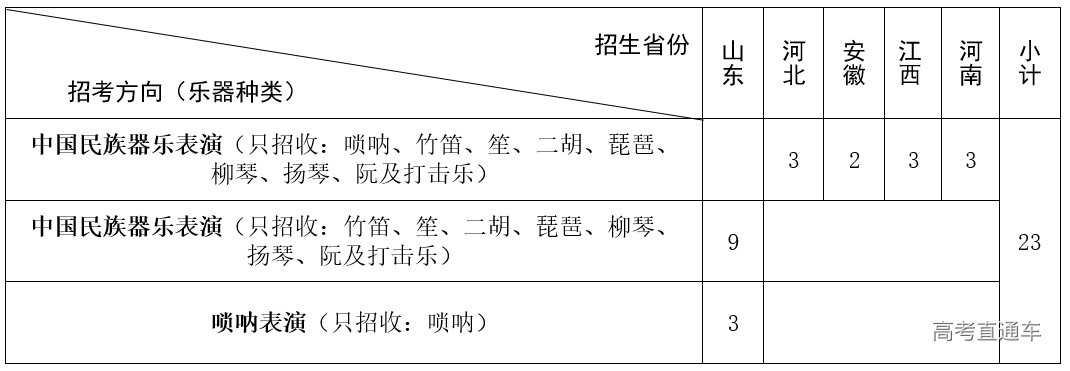注:2021年,中国民族器乐表演方向在山东省分中国民族器乐表演和唢呐表演2个方向招生,请仔细对照具体的招考方向与计划数量。