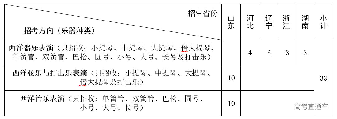 注:2021年,西洋器乐表演方向在山东省分西洋弦乐与打击乐表演、西洋管乐表演2个方向招生,请仔细对照具体的招考方向与计划数量。