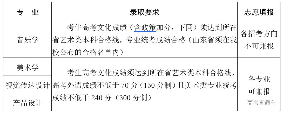 2021年起,我校艺术类各专业全部使用各省统考成绩录取(山东省音乐学专业为我校重新计算的专业成绩,方法见“报考条件”),不再单独组织专业校考。
