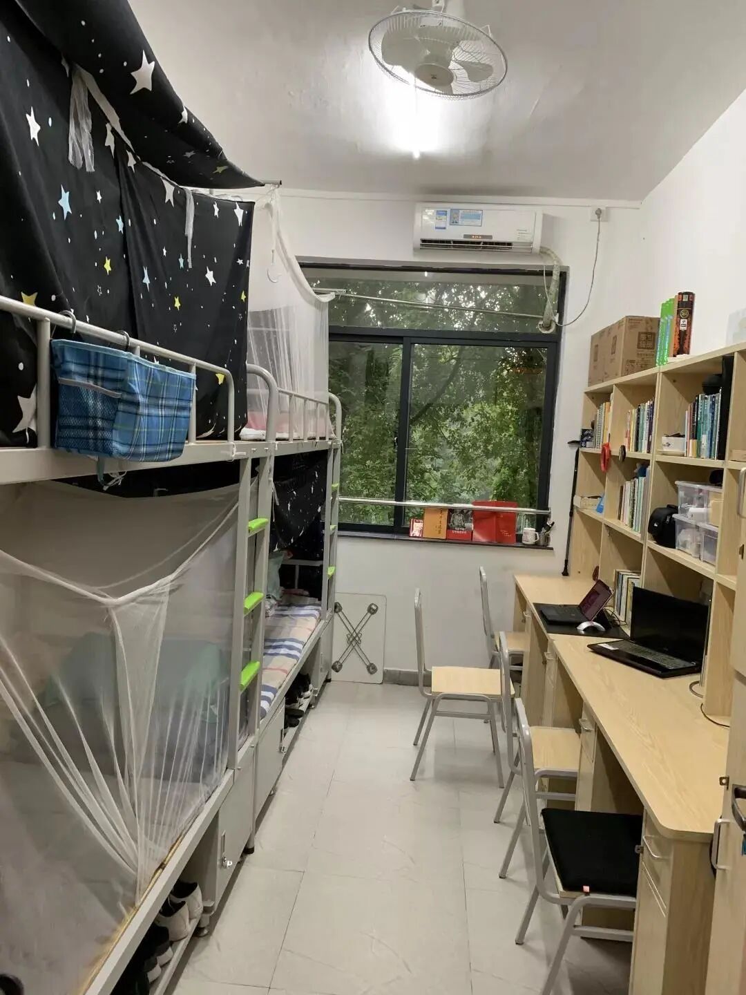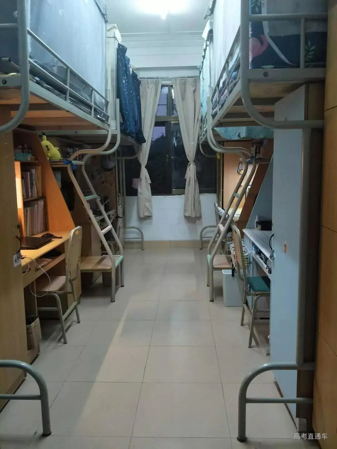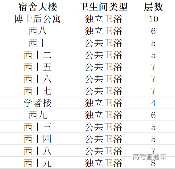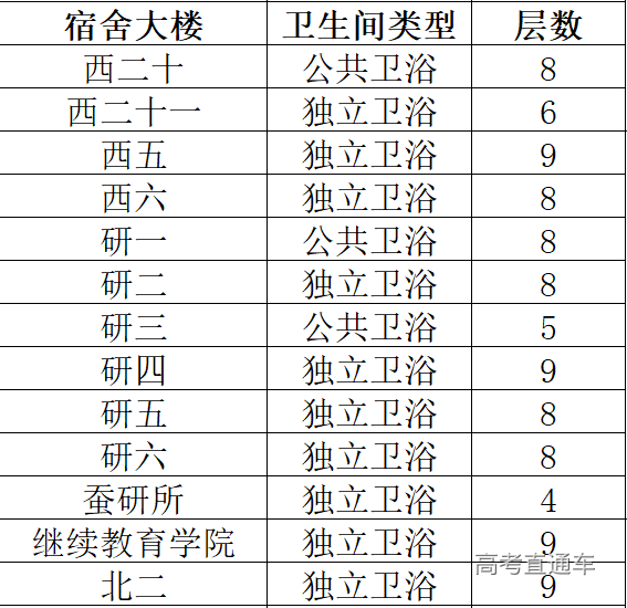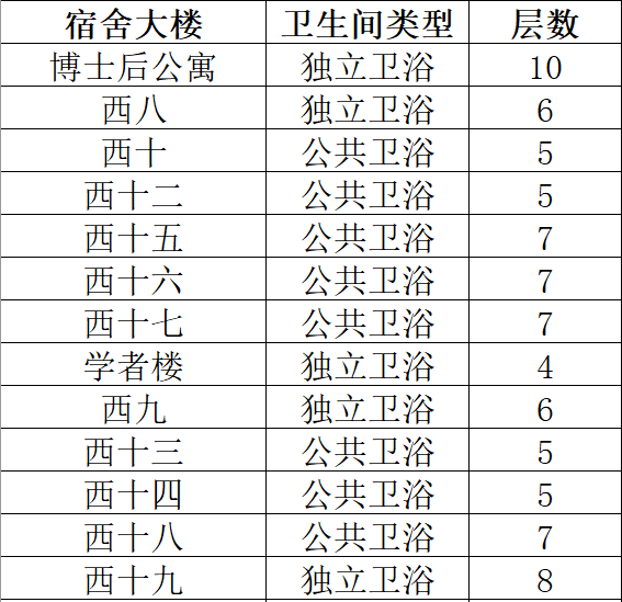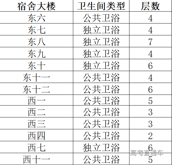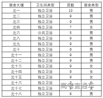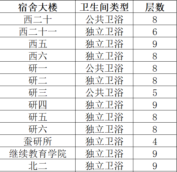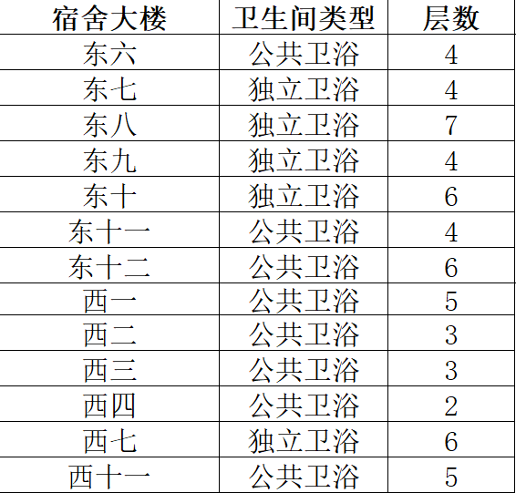 公共卫浴宿舍:淋浴间及卫生间设置于每层楼走廊中,数量按人数配比设立,宿舍内无阳台(研一宿舍楼除外)。