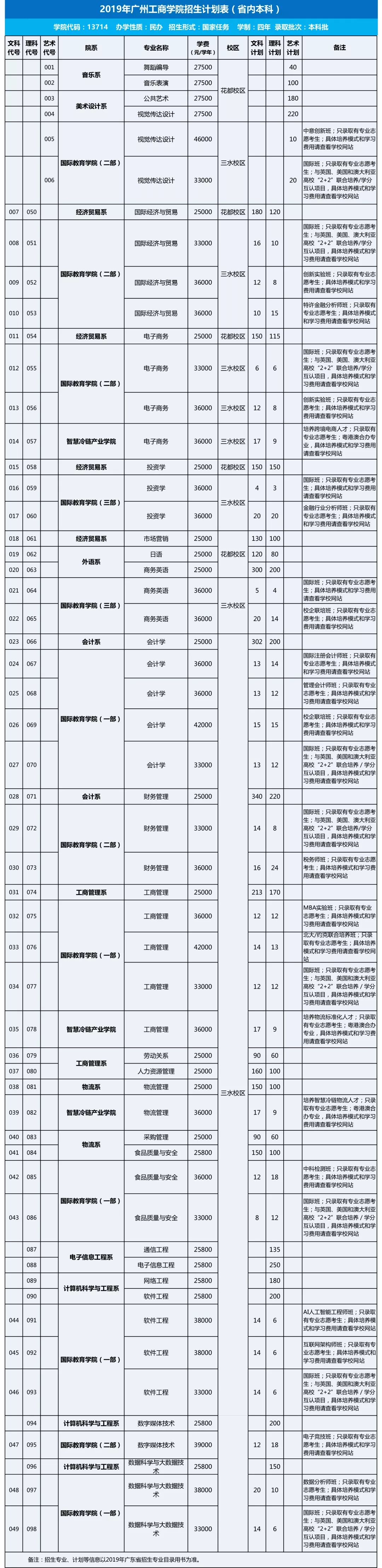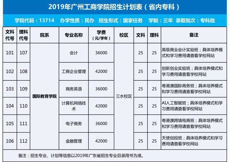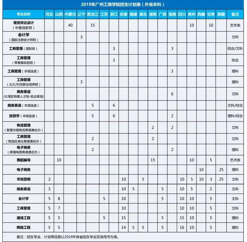 广州工商学院2019年面向全国19个省份计划招收全日制本科生7304人,专科生300人,本科总计划较去年稍有增加。其中,广东省本、专科招生计划6990人,学校录取批次为本科批次、专科批次。省外本科招生包括河北、山西、内蒙古、辽宁、黑龙江、江苏、浙江、安徽、福建、湖北、湖南、广西、海南、四川、贵州、西藏、甘肃、新疆地区,较2018年新增辽宁、内蒙古2个省份,外省总计划增加至560人。