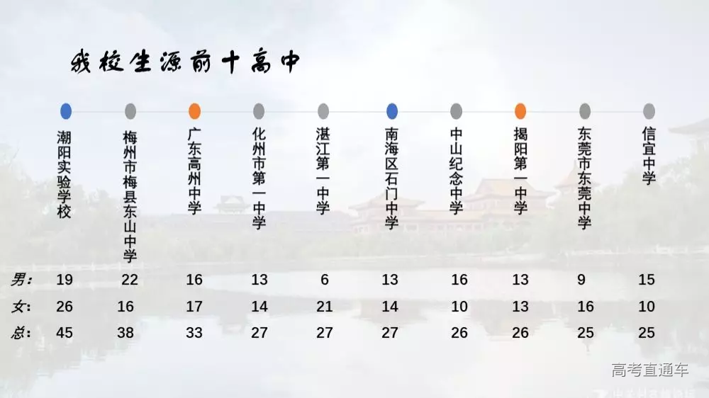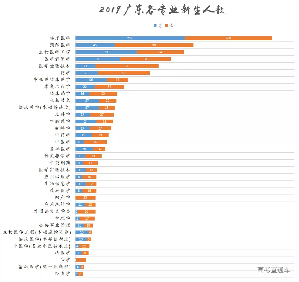 不少新生都想知道学校的男女比例 然而 对于广东新生👇 并不过度倾斜的男女比例 会不会让某些同学失望呢 详情请看下图👇 ps:点击图片可放大查看(下同) 当然这只是广东招生信息统计 据统计,2018级全校新生男女近似4:6 AND 女生略多的情况 在我校生源人数前十的高中也有所体现👇 另外 我校在广东省录取的前十名新生所在的中学 是下列这几所哦👇 敲重点! 我校在广东省普高招生的录取分数和最低排位具体如下: 2019年 广东普高 理科 2019年 广东普高 文科 2019年 广东地方专项 理科 2019年 广东地方专项 文科 最后 热烈祝贺被我校录取的新生 南医的未来有你有我 相约九月 我们不见不散