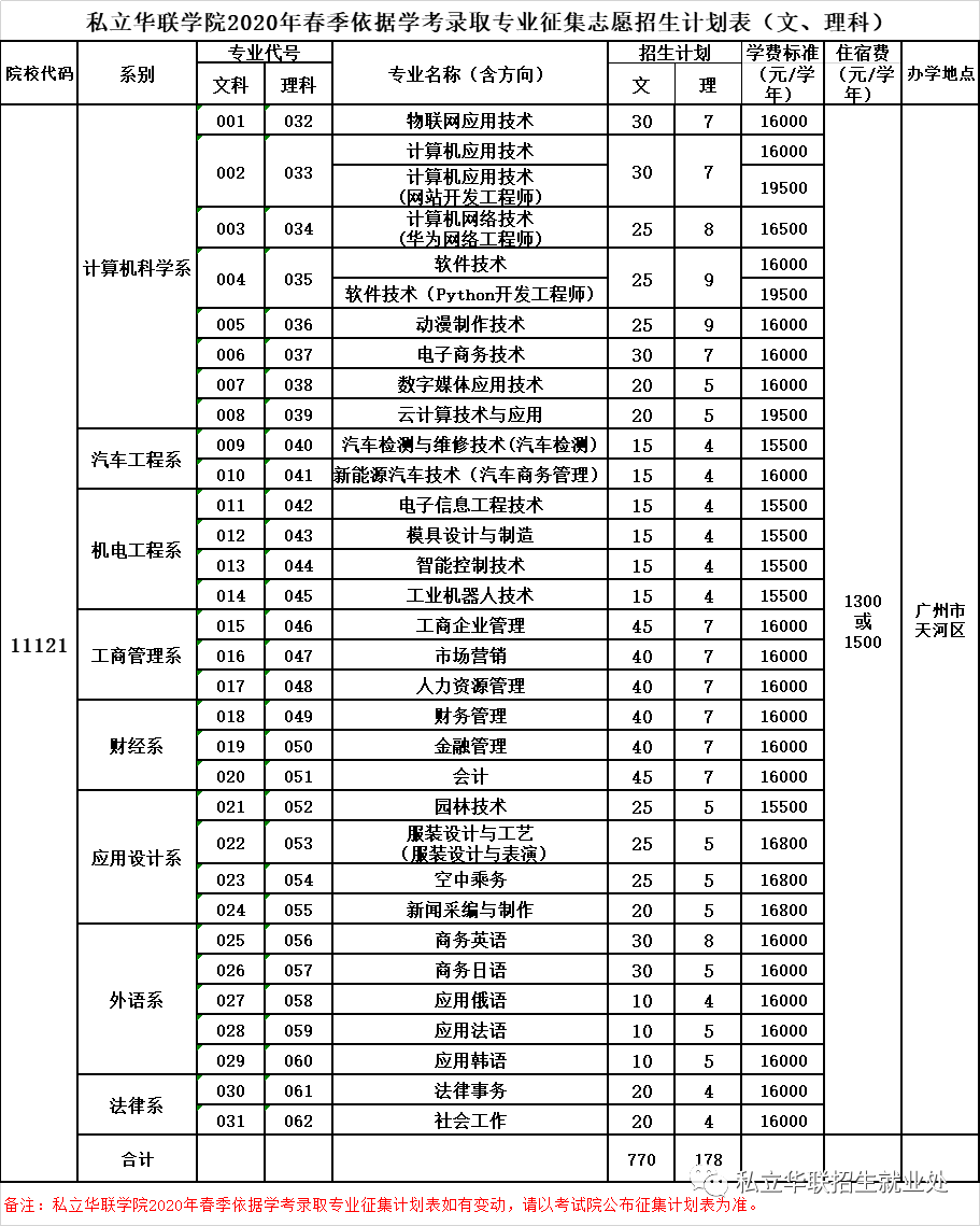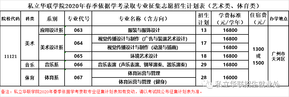 私立华联学院2020年春季依据学考录取专业征集志愿招生计划表