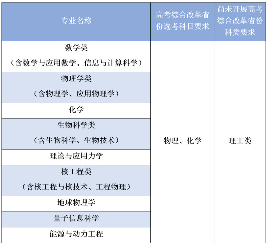 (一)我校2026年强基计划招生专业包括:数学类(含数学与应用数学、信息与计算科学)、物理学类(含物理学、应用物理学)、化学、生物科学类(含生物科学、生物技术)、理论与应用力学、核工程类(含核工程与核技术、工程物理)、地球物理学、量子信息科学、能源与动力工程。