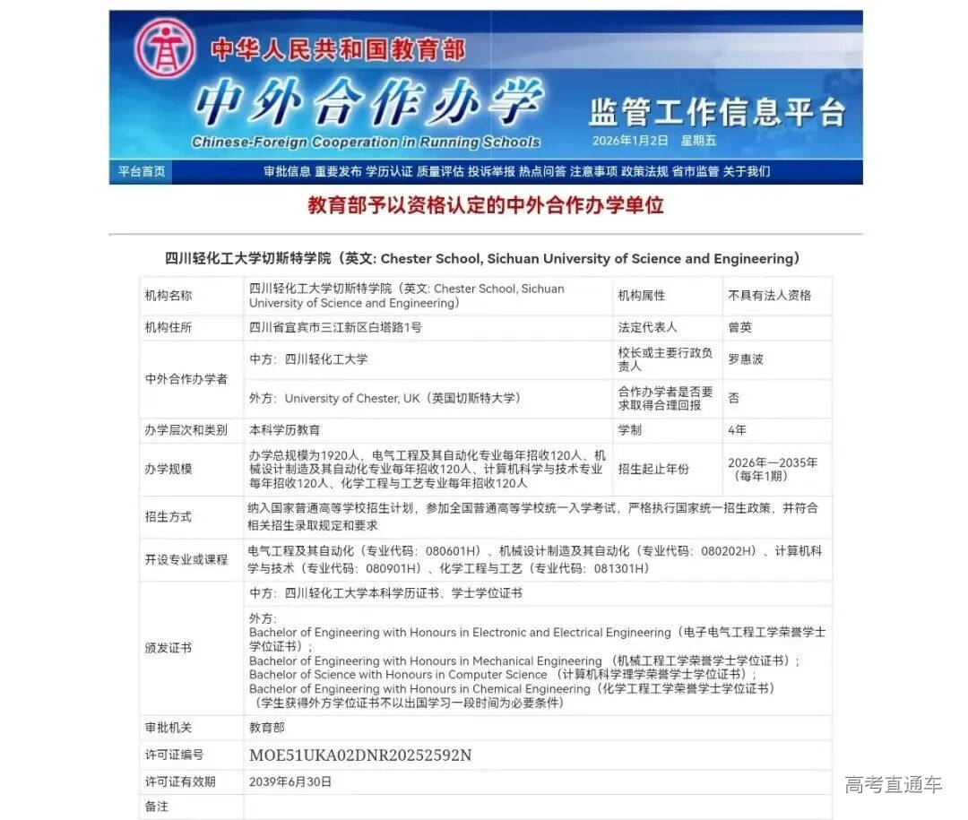 2025年12月31日,教育部公布中外合作办学机构和项目审批结果,我校与英国切斯特大学合作申报的非独立法人中外合作办学机构——四川轻化工大学切斯特学院成功获批。这是学校自2019年首次获批中外合作办学项目以来,首个获批的中外合作办学机构,实现了我校从“合作项目”到“机构共建”的历史性跨越,是学校长期推动教育对外开放、不断深化国际合作交流的重要成果和里程碑,也是学校“在地国际化”又一次“零”的突破!