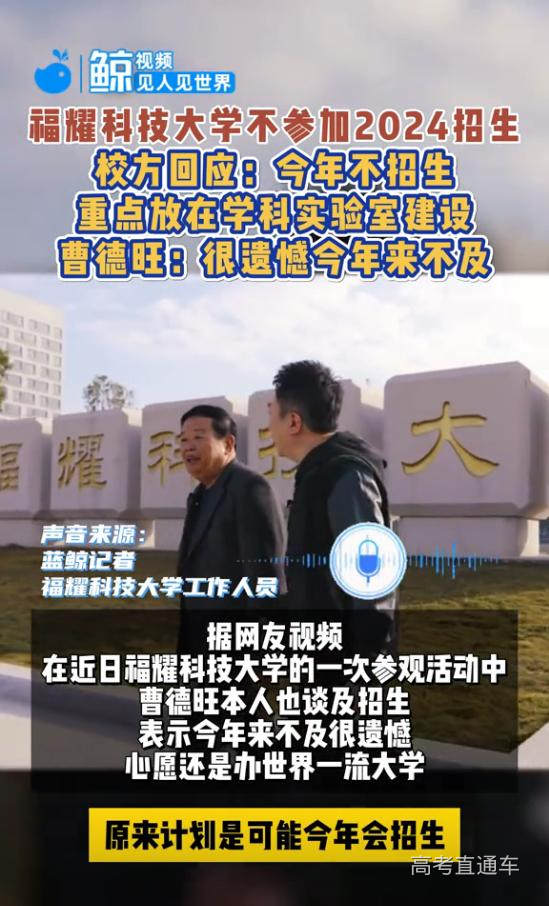 5月24日,蓝鲸记者联系到福耀科技大学校方询问“今年学校招生问题”,学校回应称,“今年暂时不开展招生,现在的工作重心是先将学校的重点实验室先建起来”。