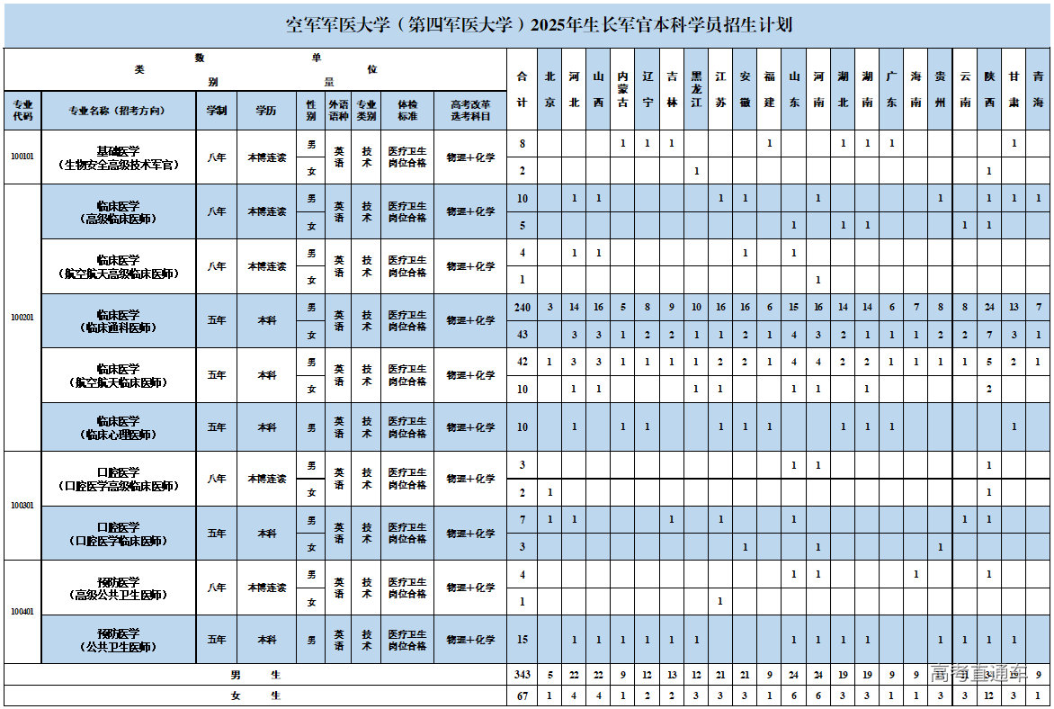 空军军医大学2025年生长军官本科学员招生计划