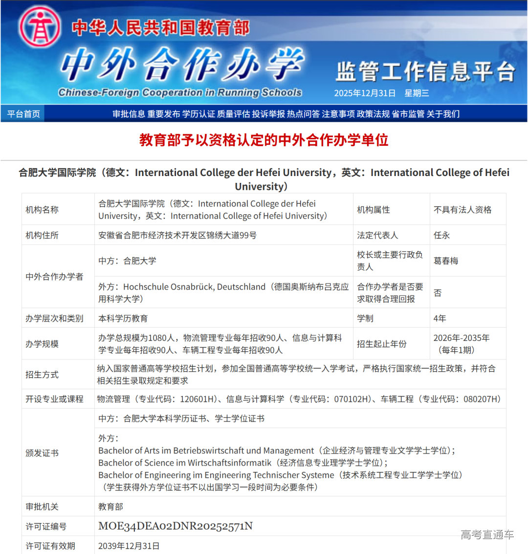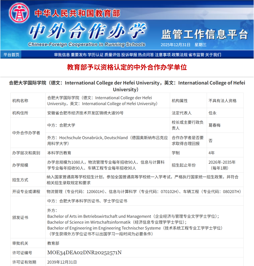 近日,教育部公布中外合作办学机构和项目审批结果,合肥大学与德国奥斯纳布吕克应用科学大学合作举办的合肥大学国际学院获批成立,标志着安徽省第二家中外合作办学机构正式落户合肥大学。
