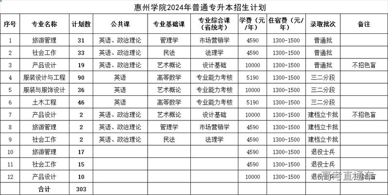 惠州学院2024年普通专升本(含建档立卡、退役士兵、三二分段)招生计划