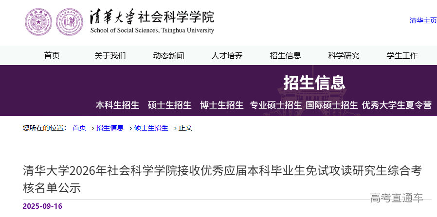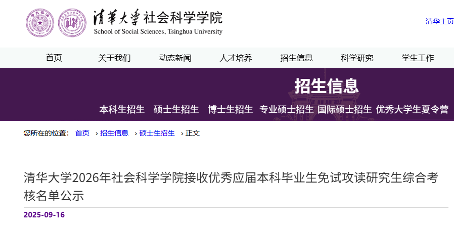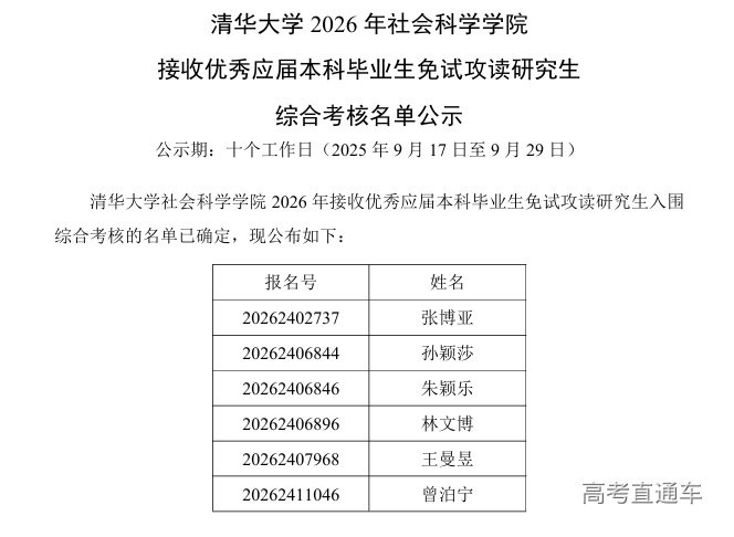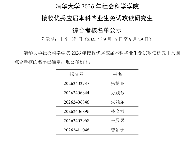 9月16日,清华大学2026年社会科学学院接收优秀应届本科毕业生免试攻读研究生综合考核名单公示,孙颖莎、王曼昱榜上有名。据公开报道,2人均为上海交通大学2019级本科生。