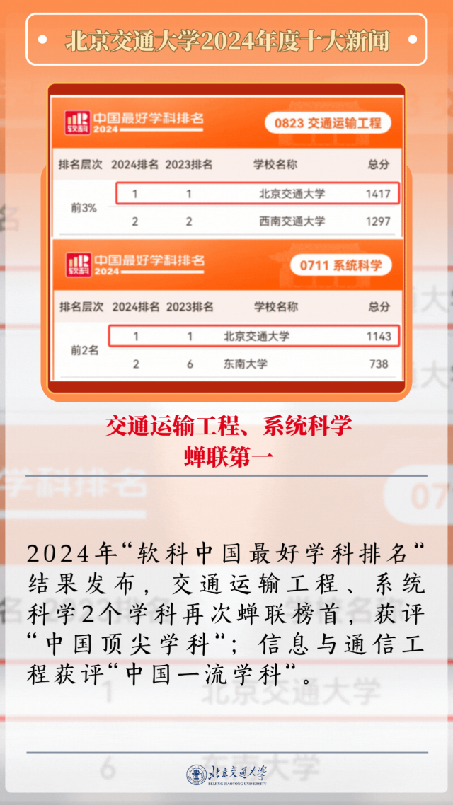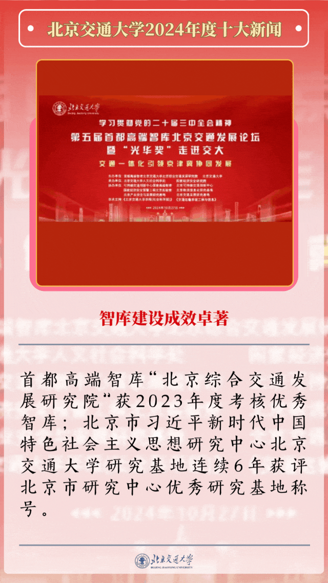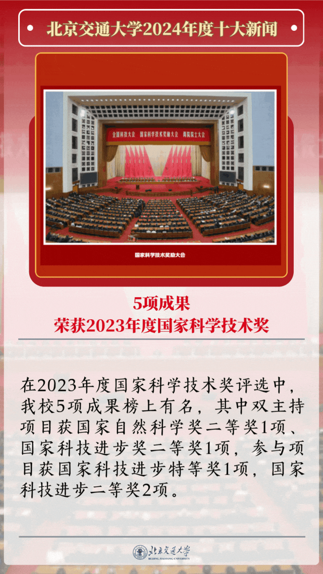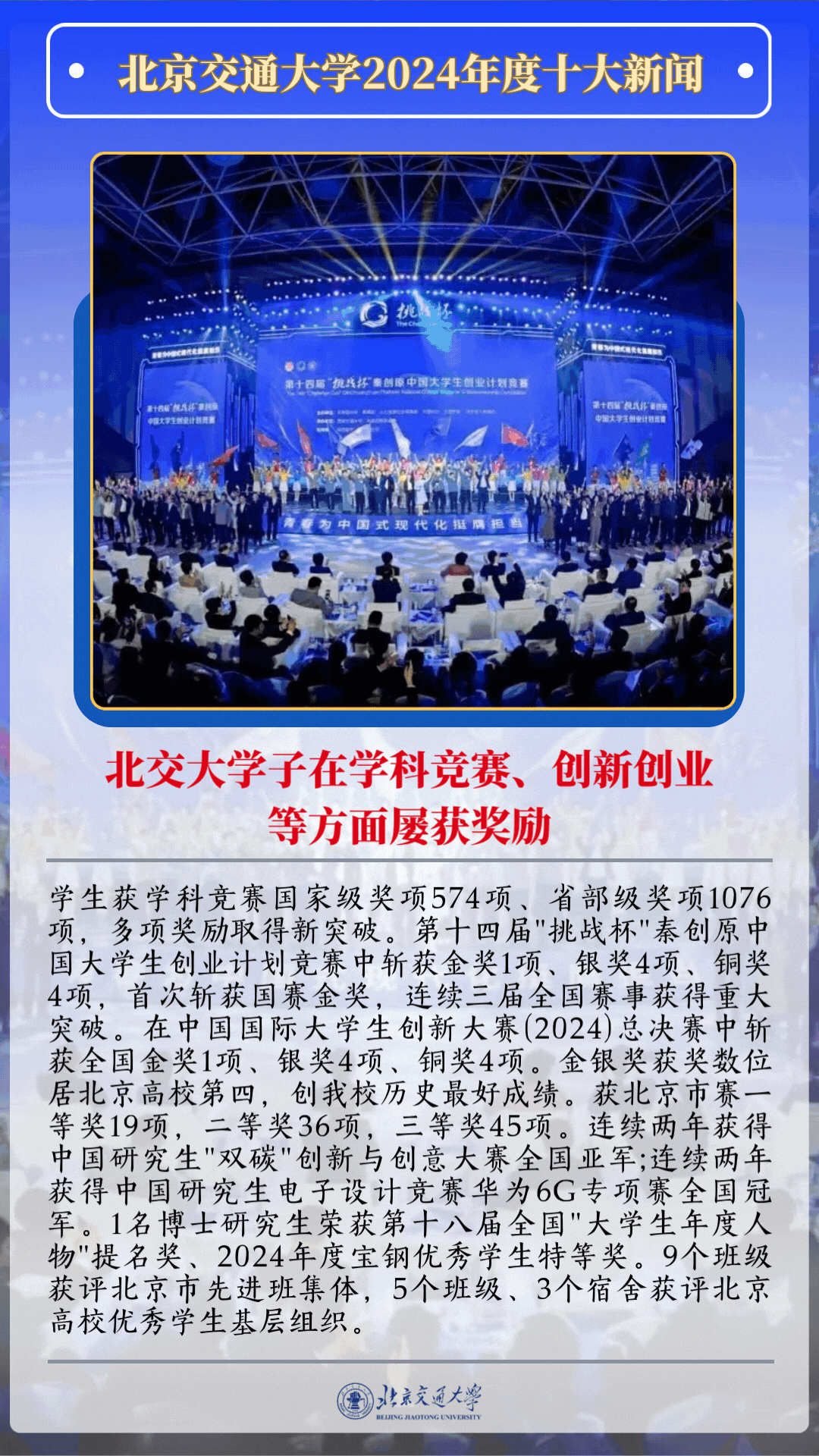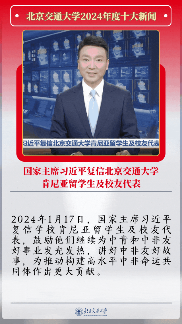 由北京交通大学党委宣传部主办的“北京交通大学2024 年度十大新闻评选”投票活动日前结束,经网友投票和专家评议,“国家主席习近平复信北京交通大学肯尼亚留学生及校友代表,5项成果荣获2023年度国家科学技术奖,交通运输工程、系统科学蝉联第一”等10条新闻入选“北京交通大学2024年度十大新闻”。
