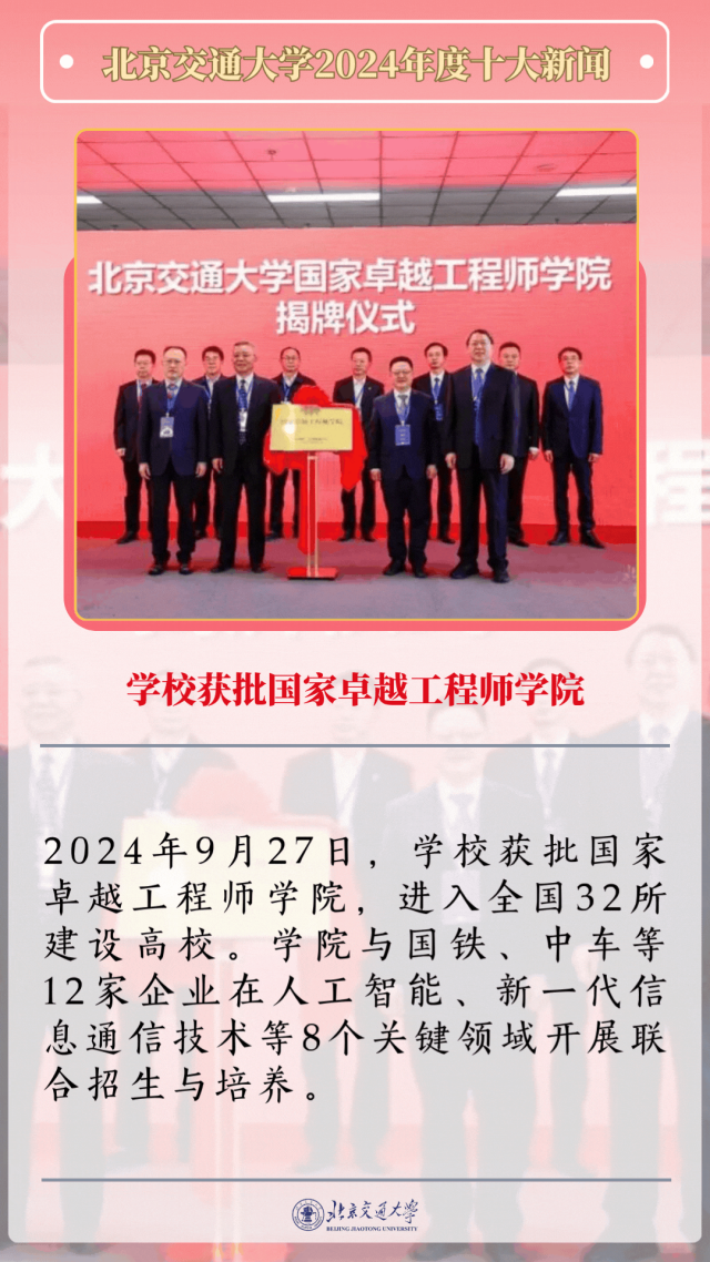 近日,北京交通大学发布2025年十大事件,其中提到:2024年9月27日,学校获批国家卓越工程师学院,进入全国32所建设高校。学院与国铁、中车等12家企业在人工智能、新一代信息通信技术等8个关键领域开展联合招生与培养。