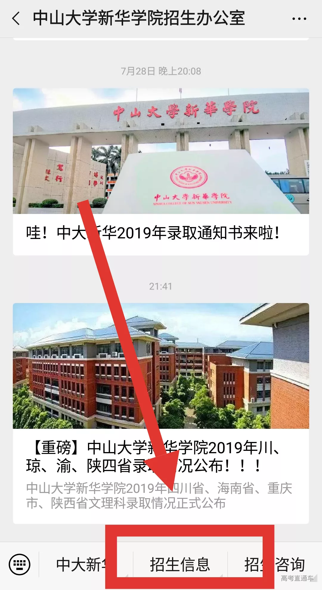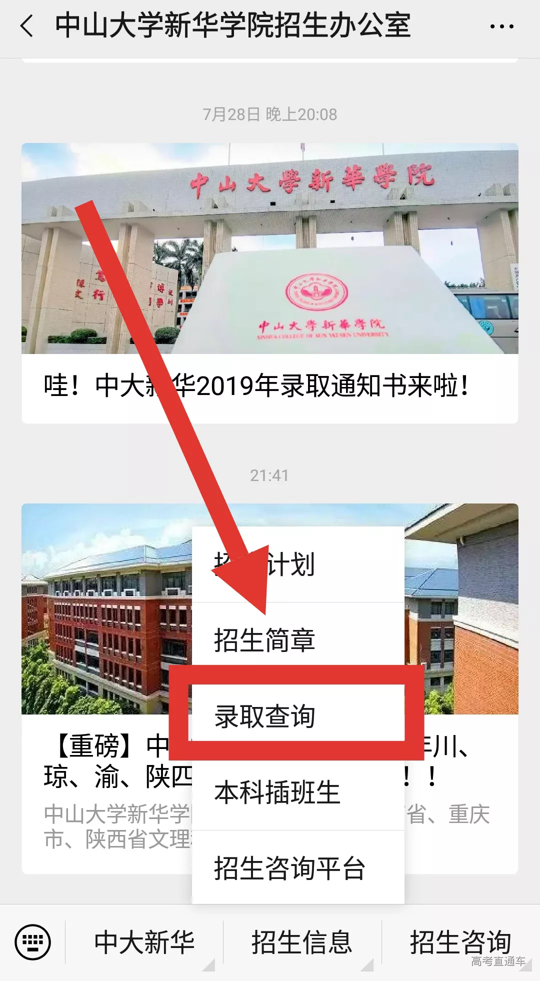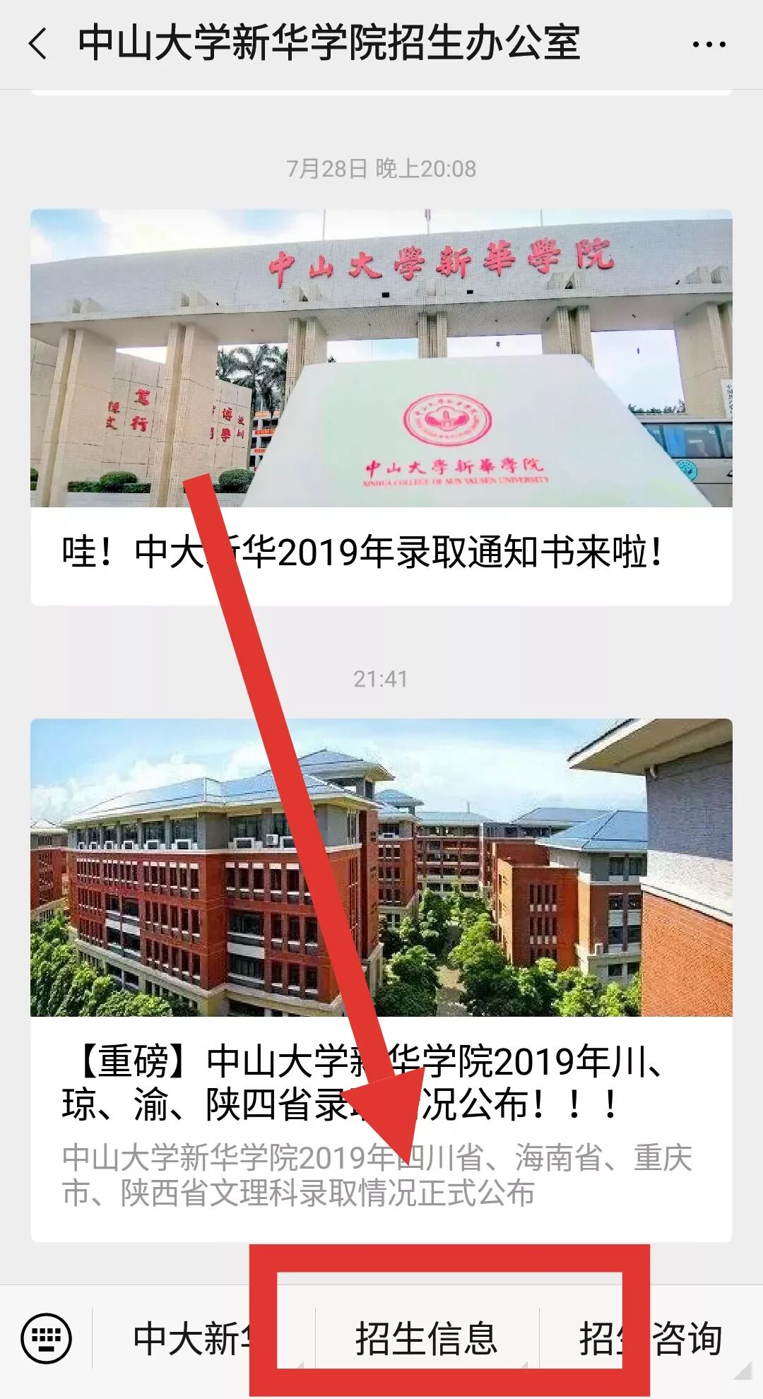(一)“中山大学新华学院招生办公室”官方微信公众号查询