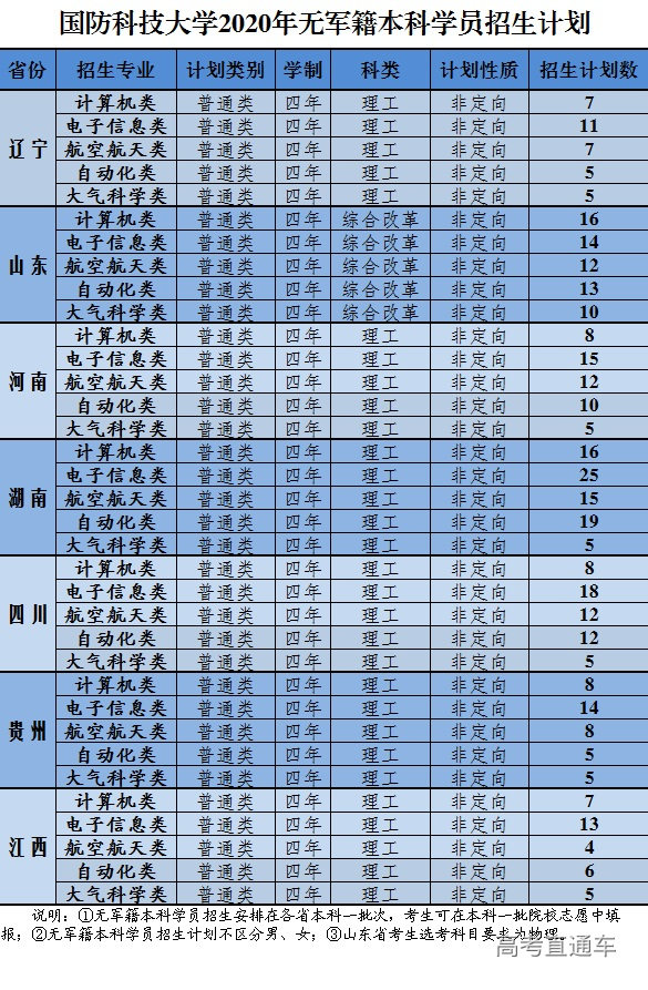 经教育部和军委机关批准,国防科技大学2020年在辽宁、山东、河南、湖南、四川、贵州和江西等7省份招收无军籍本科学员360人。学校无军籍本科学员招生安排在各省本科一批次,考生可在本科一批院校志愿中填报。无军籍本科学员招生计划不区分男、女,具体如下: