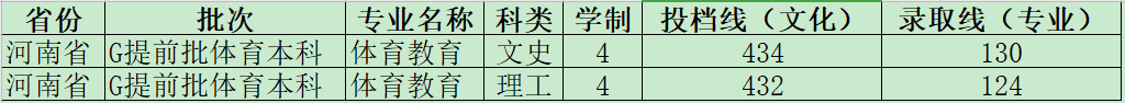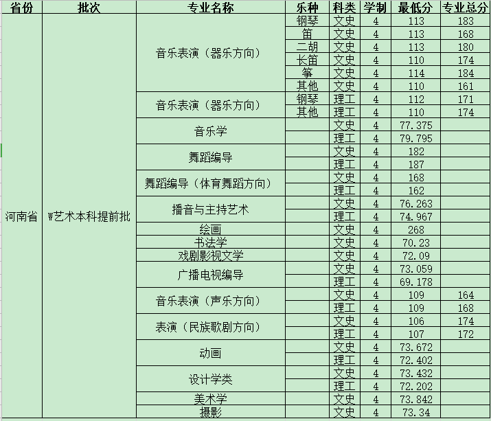 今年河南大学采用文化和专业双过线(省最低录取控制线),投档到此校,依据“志愿优先”的录取原则。 书法学、美术学、摄影、设计学类、动画按综合成绩高低录取,绘画按专业成绩高低录取。 其中,书法学今年文史类最低录取分数线70.23,相比去年增长了1.43分;美术学文史类最低录取分数线73.842相比去年增长2.642分;摄影文史类最低录取分数线73.34相比去年增长2.44分。绘画文史类最低录取分数线268分,相较去年增长3分。 值得注意的是,设计学类和动画类录取规则与往年文过专排的录取规则不同,按综合成绩高低录取。设计学类今年最低录取分数线文史类73.432分,理工类72.202分;动画今年最低录取分数线文史类73.672分,理工类72.402分。 音乐学按综合成绩高低录取。 音乐表演(声乐方向)、表演(民族歌剧方向)要求视唱及格,按主科成绩高低录取(不低于100分,并列按专业总分);音乐表演(器乐方向)要求视唱及格,分乐种,按主科成绩高低录取(不低于95分,并列按专业总分); 2020年音乐表演(声乐方向)最低投档分数线文史类109分相较去年增长了15分,理工类109分相较去年增长了20分;表演(民族歌剧方向)最低投档分数线文史类106分相比去年增长了14分,理工类107分相较去年增长了19分;音乐表演(器乐方向)最低投档分数线理工类钢琴乐种112分,其他乐种110分,相比去年增长了20分。 舞蹈编导(艺术舞蹈)按专业总分高低录取(不低于160分),今年最低录取分数线文史类182分,理工类187分。 舞蹈编导(体育舞蹈方向)按专业总分高低录取(不低于145分),今年最低录取分数线文史类168分,比去年增长8分;理工类162分,比去年增长13分。 播音与主持艺术按综合成绩高低录取。今年最低录取分数线文史类76.263分,相比去年增长0.763分,理工类74.967分,相比去年增长0.767分。 广播电视编导、戏剧影视文学按综合成绩高低录取。 广播电视编导今年最低录取分数线文史类73.059分,相比去年增长了1.859分,理工类69.178分比去年降低了1.222分。戏剧影视文学今年最低录取分数线文史类72.09分,比去年增长了1.09分。 河南大学提前批体育本科录取原则为文化和专业双过线(省最低录取控制线);考生投档到该校(河南省投档规则为按文化成绩高低投档),按专业成绩高低录取。 同时,专业成绩不低于120分(满分的80%),男身高不低于172cm,女身高不低于162cm。今年,河南大学提前批体育本科,文史类录取分数线(文化)为434分,比去年增加12分,专业录取线为130分,比去年增加11分;理工类,录取分数线(文化)432分,比去年增长98分,专业录取线为124分,比去年增长23分。 提 醒 以上各专业综合成绩计算办法,以河南省招生办公室公示的统一计算公式为准。 公示地址: http://www.heao.gov.cn/adc/pzyslqgz.shtml,输入河南大学查询。