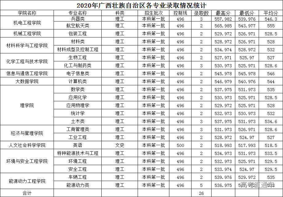 2020年中北大学在广西省分专业录取分数线