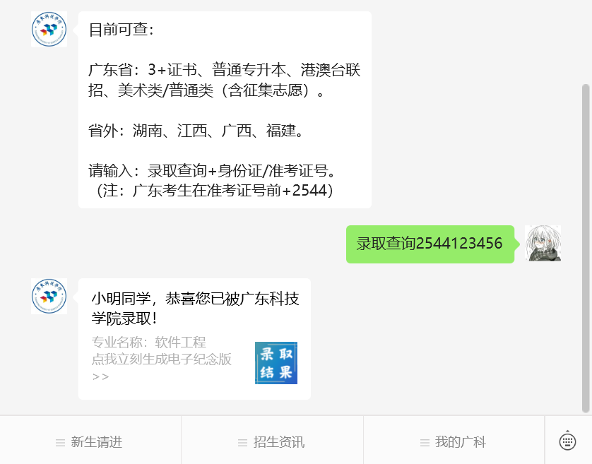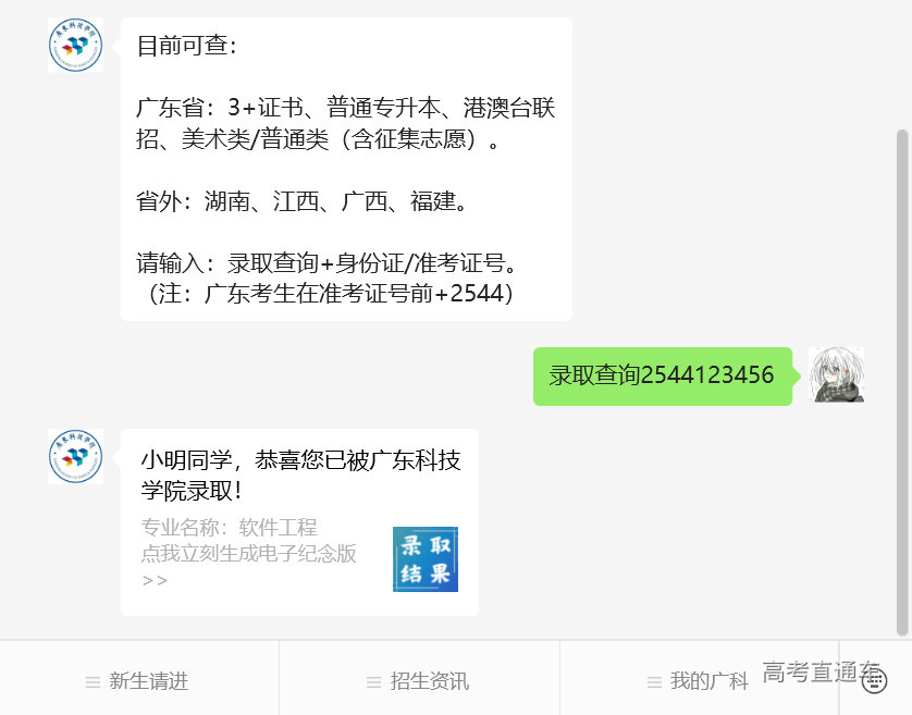 2.在“广东科技学院招生办”微信公众号后台输入录取查询+身份证/准考证号。(注:广东考生在准考证号前+2544)即可查询。