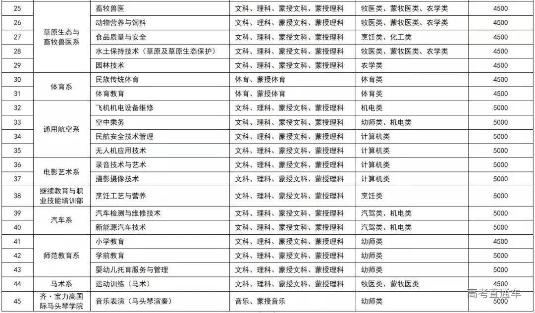 学院开设的46个高职专业(含方向)覆盖现代畜牧业、现代制造加工业、现代服务业、能源动力、交通运输、新闻传播、生物化工、电子信息、财经商贸、医药卫生、民族文化等15个领域,就业岗位分布广泛,所有高职专业均可参加全区专升本考试升入区内本科院校的本科专业继续深造。学院已建成以高等专科职业教育为主,中职教育为辅的现代职业教育体系。曾与内蒙古工业大学、内蒙古师范大学、内蒙古医科大学、内蒙古农业大学、赤峰学院等高校合作举办热能动力工程、电气自动化技术、体育教育(足球方向)、学前教育、蒙医学、食品质量与安全、护理等专业应用本科教育,取得显著成效。