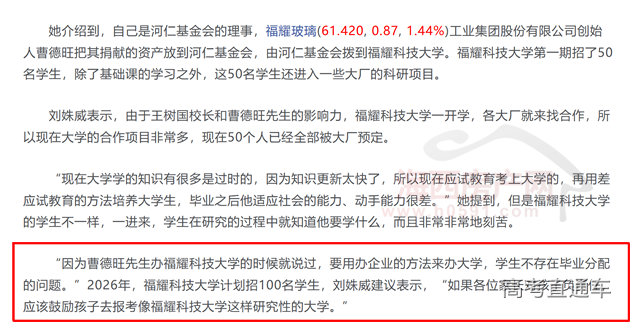 由于王树国校长和曹德旺先生的影响力,福耀科技大学一开学,各大厂就来找合作,所以现在大学的合作项目非常多,现在50个人已经全部被大厂预定。
