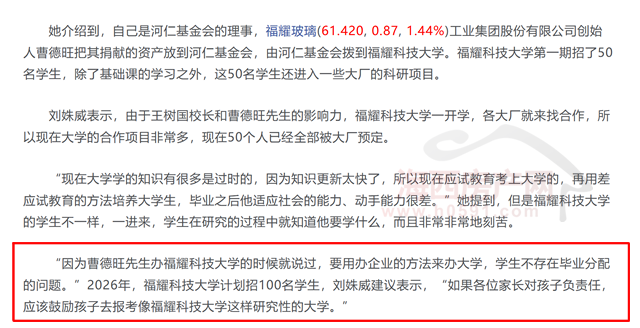 刘姝威还透露,2026年福耀科技大学计划招100名学生。如果各位家长对孩子负责任,应该鼓励孩子去报考像福耀科技大学这样研究性的大学。