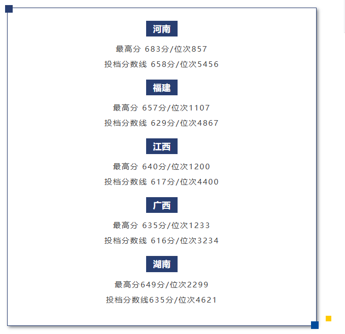 其中,河南投档分数线 658分/位次5456,最高分 683分/位次857;福建投档分数线 629分/位次4867,最高分 657分/位次1107;江西投档分数线 617分/位次4400,最高分 640分/位次1200;广西投档分数线 616分/位次3234,投档分数线 616分/位次3234;湖南投档分数线635分/位次4621,最高分649分/位次2299。