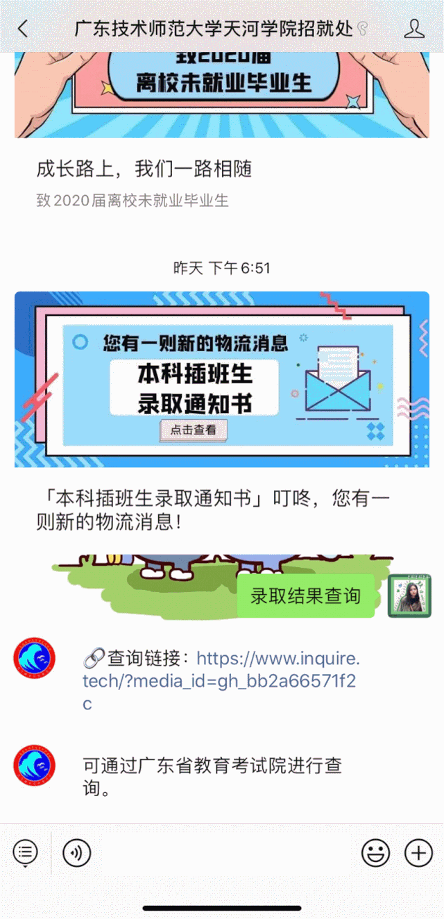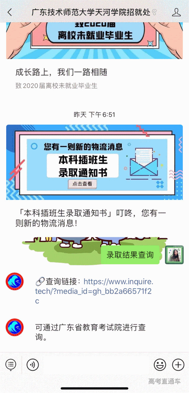 招生计划160,投档数160。 投档最高分489,投档最低分457; 最高排位8661,最低排位17366。 2020年我校美术类最低投档分为457分,高出省划线综合分48.5分。 🎵音乐类 招生计划100;投档数100。 投档最高分473,投档最低分455; 最高排位2894,最低排位4397。 2020年我校音乐类最低投档分为455分,高出省划线综合分70分。 ⚠注: 综合分=文化分×40%+术科统考分×60%×2.5 目前,我校美术类、音乐类 录取工作已完成 现可查询录取情况 更多招生录取权威资讯,可持续关注我校官方微信公众号&招生与就业指导处微信公众号。 查询方式 ①自助查询 ②短信推送 广东省教育考试院将通过号码为110639678或106904886或10690045165向被录取的考生在高考志愿填报系统绑定的手机号码发送录取结果。 ③广东技术师范大学天河学院招就处 在“广东技术师范大学天河学院招就处”后台回复“录取结果查询”→点击“查询链接”→选择“2020年普通高校录取结果查询”→输入考生信息→查看录取结果 ④广州理工学院招生网 网址:http://zsb.thxy.edu.cn/ 填写考生准考证号即可查询录取结果。