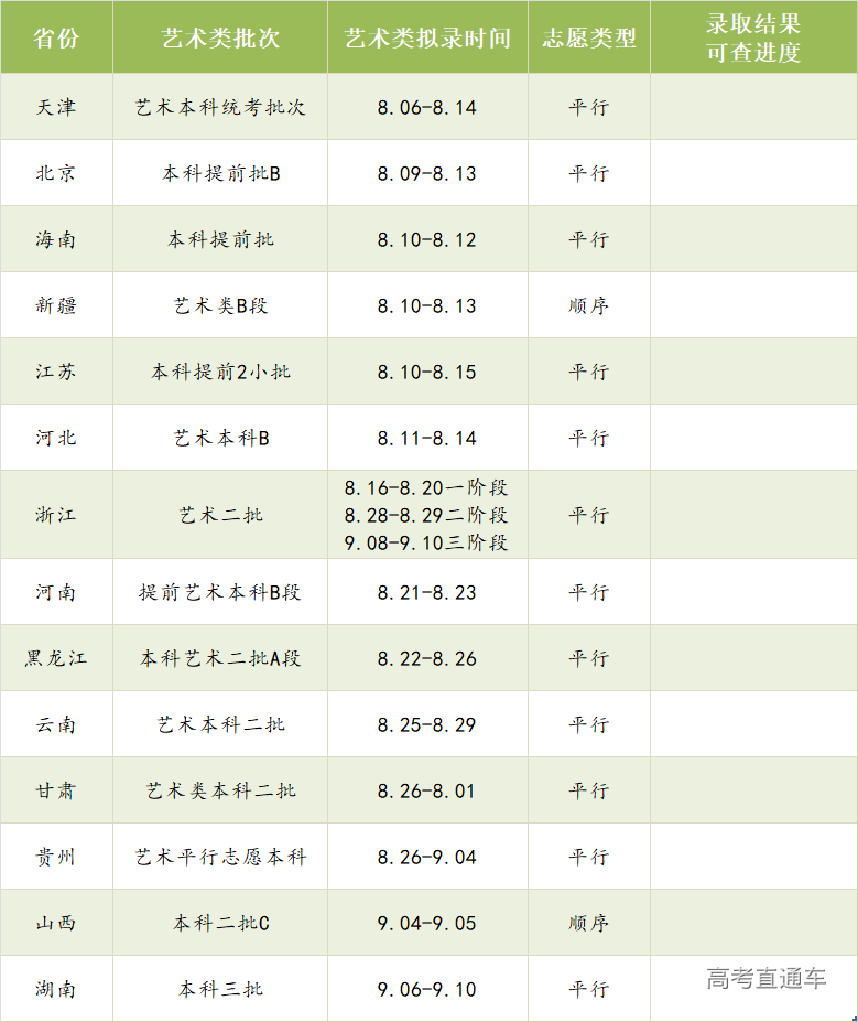 现将学院艺术类专业在各地录取时间(具体以当地公布的时间为准)及在我院网上录取结果查询的进度表公布如下: