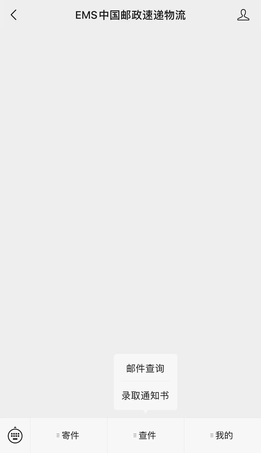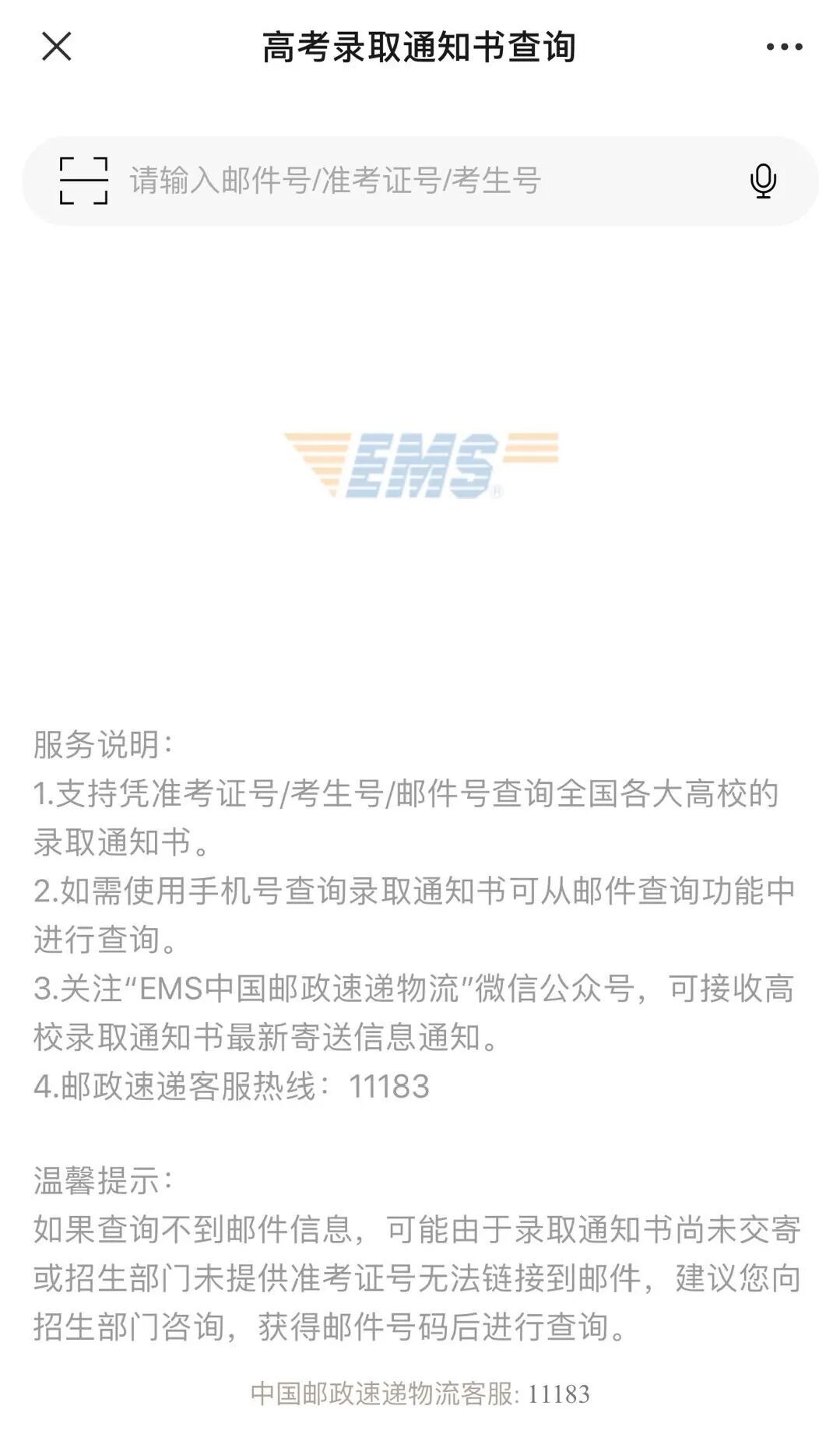 EMS速递信息查询: 通过关注“EMS中国邮政速递物流”微信公众号,点击“查件-录取通知书”,输入考生号(14位数)即可实时关注录取通知书动态(查询方法如下)。