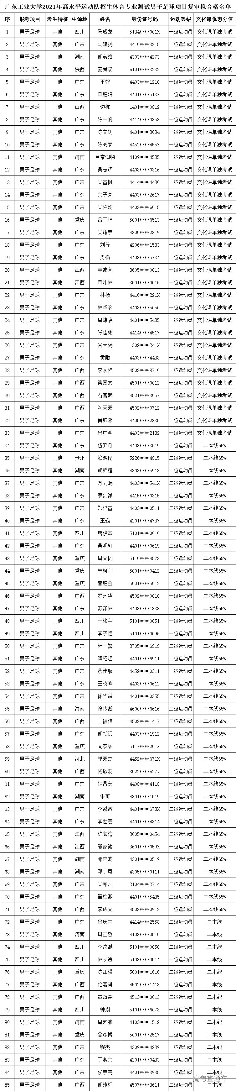 根据《体育总局办公厅 教育部办公厅关于进一步加强和规范运动员技术等级称号授予管理及考生资格审核工作的通知》(体科字(2019)141号)精神和《2021年广东工业大学高水平运动队招生简章》有关规定,经考生报名和我校高水平运动队考生报名资格审核小组初审及复审,拟定我校2021年高水平运动队男子足球项目报名资格复审合格名单,现予以公示。公示期内如有任何异议,请以电话或电子邮件方式向我办反映。反映时须提供真实姓名,须有具体事实。匿名举报或不能提供事实材料,一律不予受理。