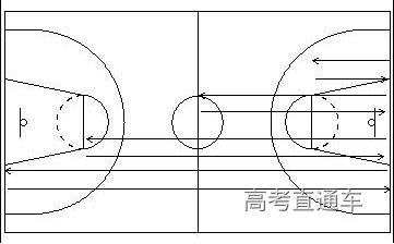 测试方法:考生站在场地端线,听到指令后进行后场罚球线延长线、中线、前场罚球线延长线、前场端线折返跑,循环一次 , 脚触线为准(出发和终点除外)。否则每次扣得分1分;每人一次机会。(如图1所示)