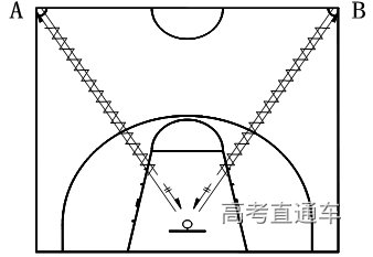 测试方法:考生由球场左侧边线与中线交点处A开始,同时计时,面向球篮以右手运球上篮(右手投篮)。球投中篮后(不中篮需补中),运球至右侧边线与中线交点B处,然后折转(不能持球转身),换左手运球上篮(左手投篮),球中篮后(不中篮需补中),运球回到原起点A处,重复上述过程一次,(上篮手不对每次扣一分)停表。(如图2所示)