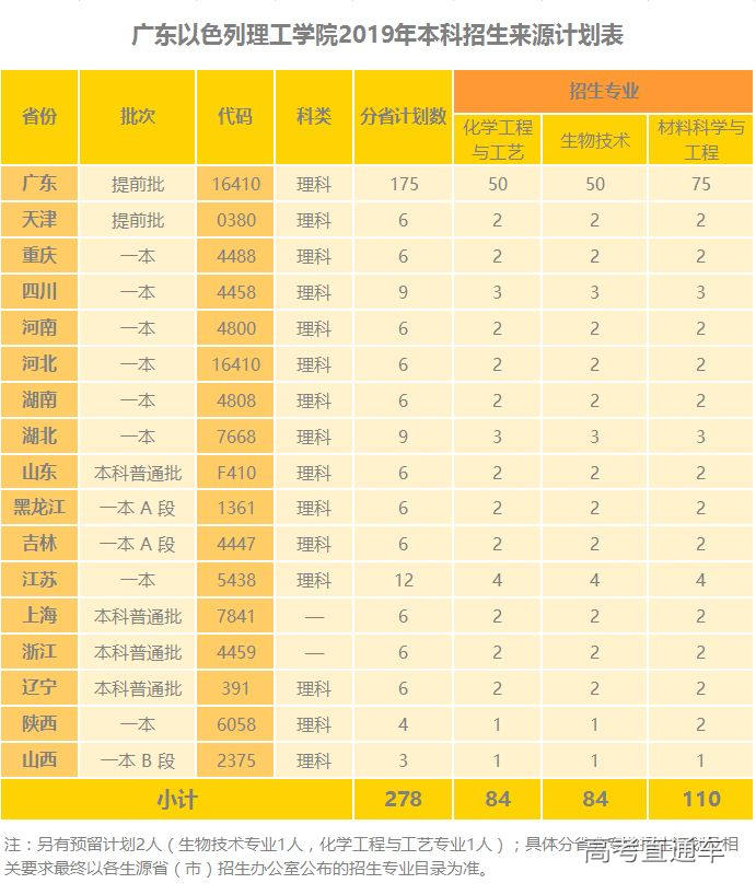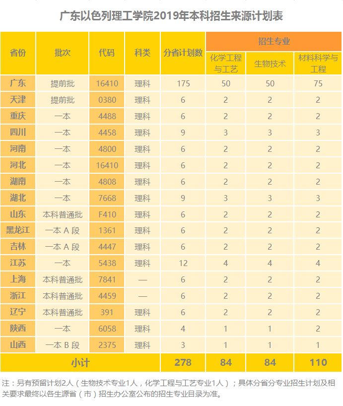 广东以色列理工学院2019年本科招生计划正式发布啦!2019年,广以将在广东、天津、上海、浙江、江苏、山东、湖南、湖北、河南、河北、黑龙江、吉林、辽宁、四川、重庆、陕西、山西等17省(市)共招收280名本科生。招生专业与2018年相同,即化学工程与工艺、生物技术、材料科学与工程三个专业。