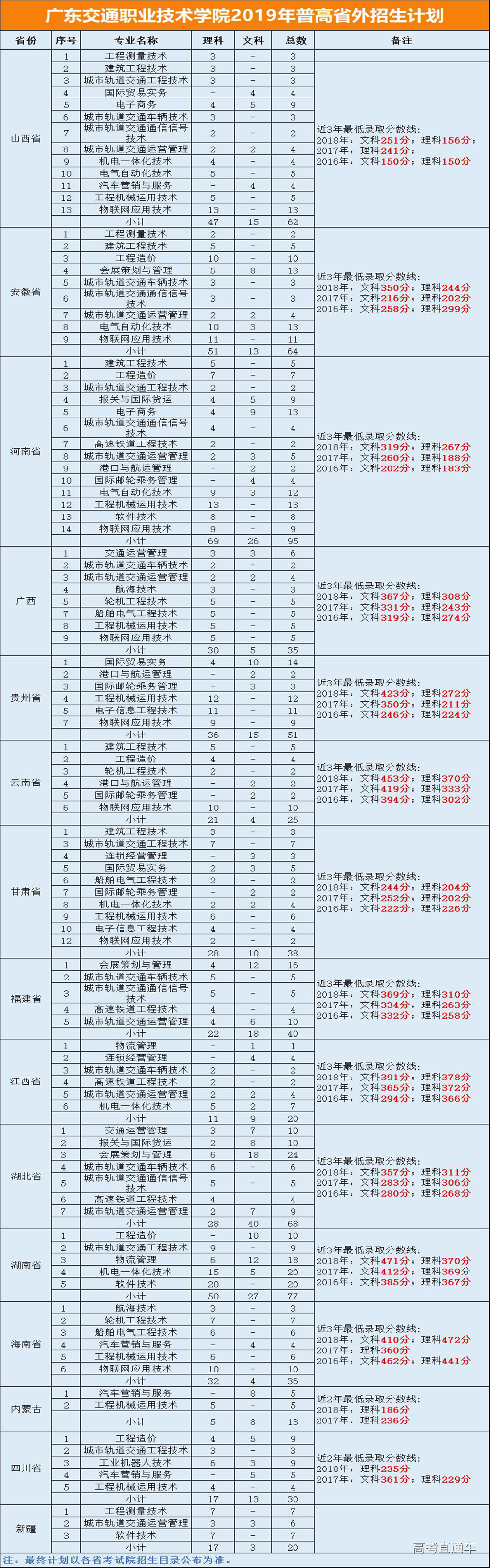 2019年教育部下达我校高职招生计划8649人(含分类招生),面向16个省(自治区),其中广东省夏季普高类计划4882人,省外夏季普高计划674人,欢迎广大考生报考。