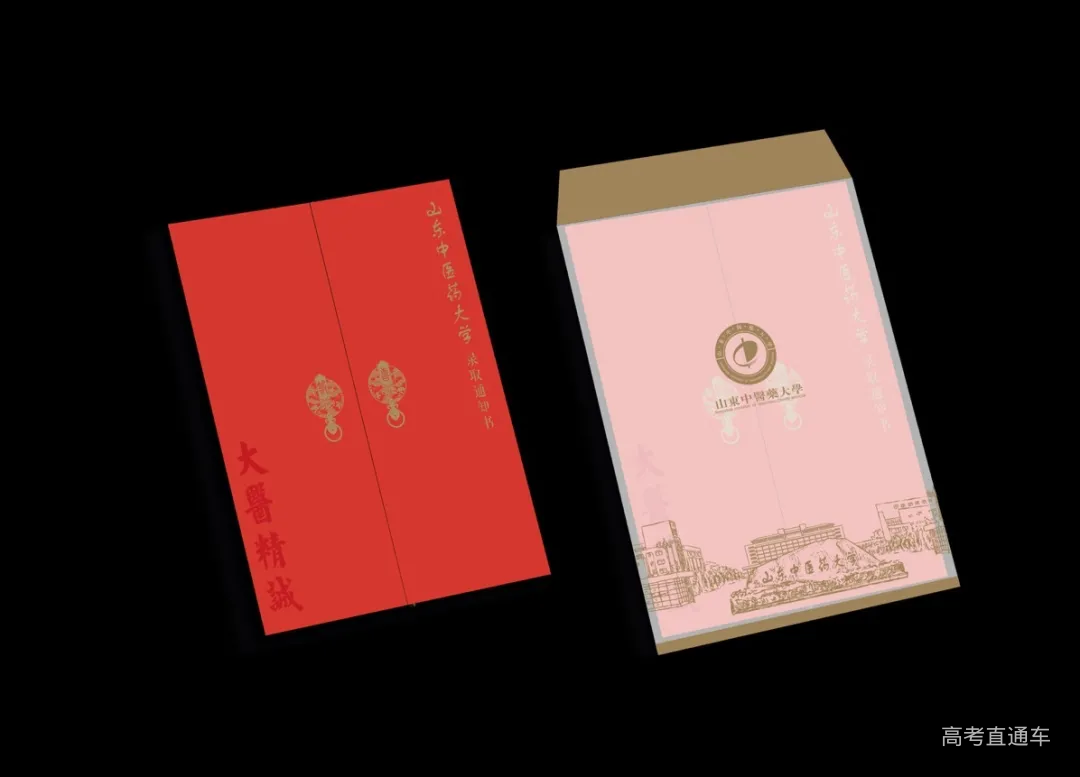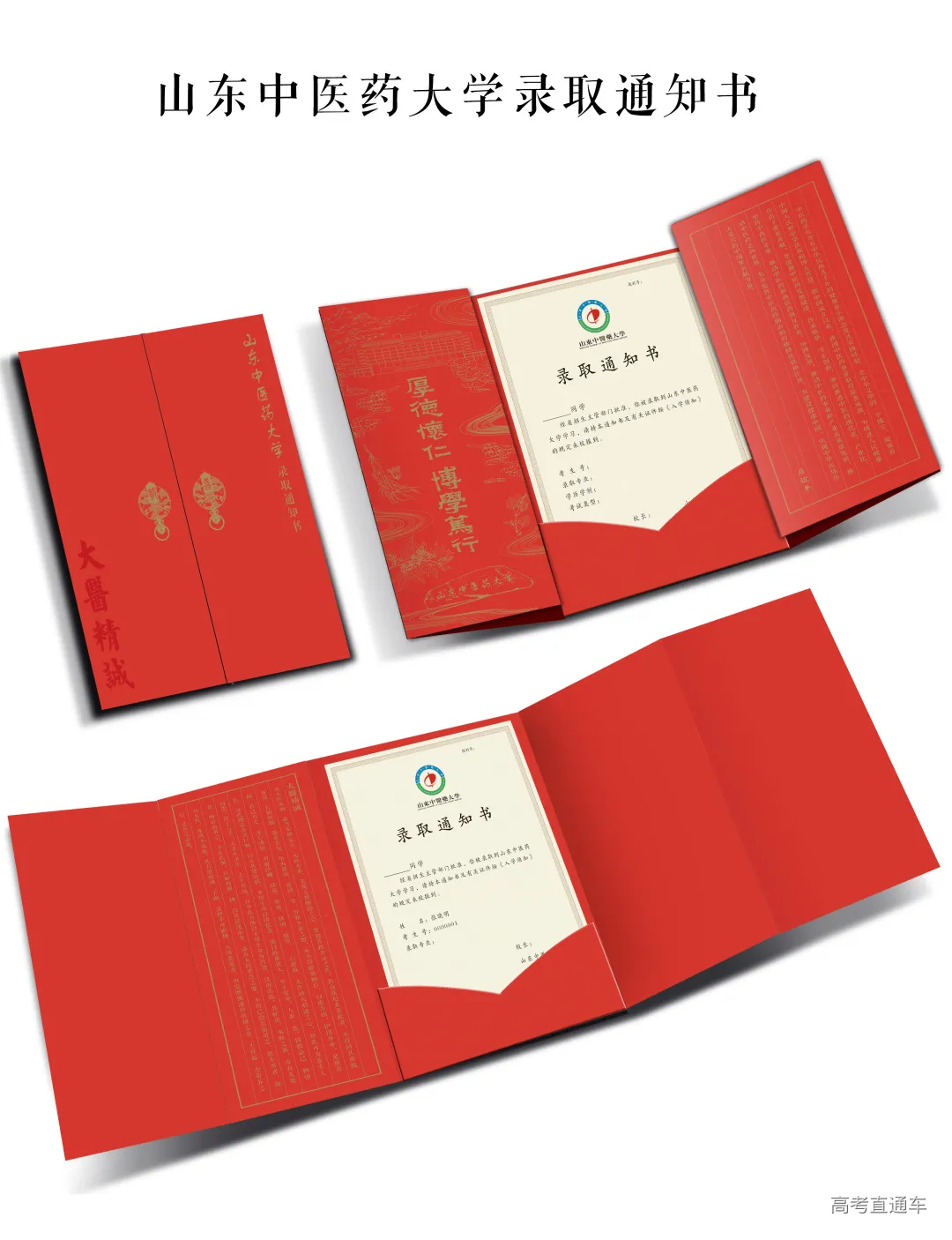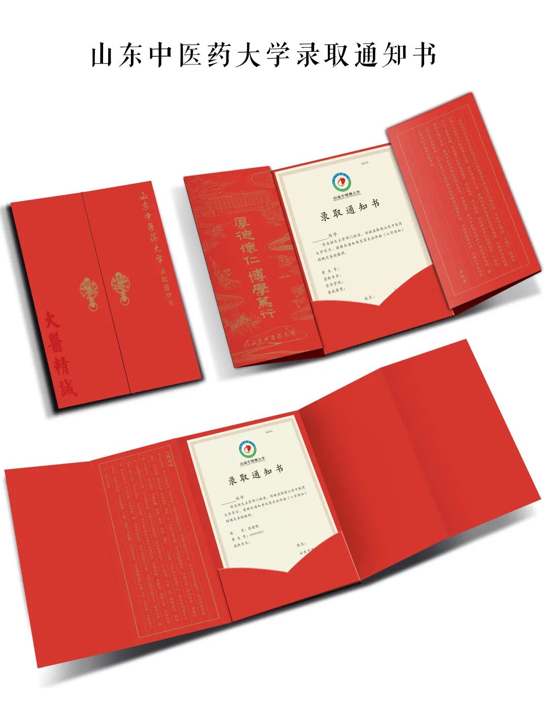 通知书主体精装立册,简约大方,既体现录取通知书的隆重,又方便学生长期珍藏。通知书以开门折形式打开,寓意开门纳新、欢迎之意,祝贺广大学子步入大学之门开启新的学习生活;封面采用中国传统门环设计,左右两个门环以中草药、祥云、喜鹊为主要元素组合而成,并配以“喜报”二字,体现了山东中医药大学特色元素,也寓有喜庆、祝贺之意;“大门”双层折叠徐徐打开,寓意对中医药学浩瀚知识的步步探索。细微设计体现我校对学生们的浓浓之情。 打开通知书“大门”,左侧映入眼帘的为我校校训“厚德怀仁 博学笃行”,配以中草药、祥云以及我校图书馆;右侧为习近平总书记在全国中医药大会上关于中医药工作的重要指示,深刻阐明了创新发展中医药的重要意义和时代价值,为新时代中医药工作指明了方向。通知书内侧为《大医精诚》重要论述,《大医精诚》是我国古代论述医德的一篇极其重要的文献,出自唐代医家孙思邈所著《备急千金要方》第一卷,是习医者必读之经典。《大医精诚》重点论述了有关医德的两个问题,即“精”与“诚”。“精”,即医者应有精湛的医术,“诚”,即医者应有高尚的道德修养。自古以来,凡名医大贤者,如孙思邈、张仲景、李时珍、张锡纯等,无不是医术精湛,医德高尚。尤其被誉为“药王”的孙思邈先生,在《大医精诚》中的经典论述,使其成为以德养性、以德养身、德艺双馨的典范,深受大众百姓的景仰和推崇,为后世医者树立了榜样,被历史铭记。 山东中医药大学通知书正文页采用双联设计,主联学生留作纪念,附联学校报到留存,既保留了通知书的报到功能,也为广大学子留存一份入学纪念。通知书局部烫金,其余采用印金工艺,厚重大气,内敛而不失活泼,体现着中医药的深厚文化底蕴,激励我们不断守正创新。 我们在这等你哟!