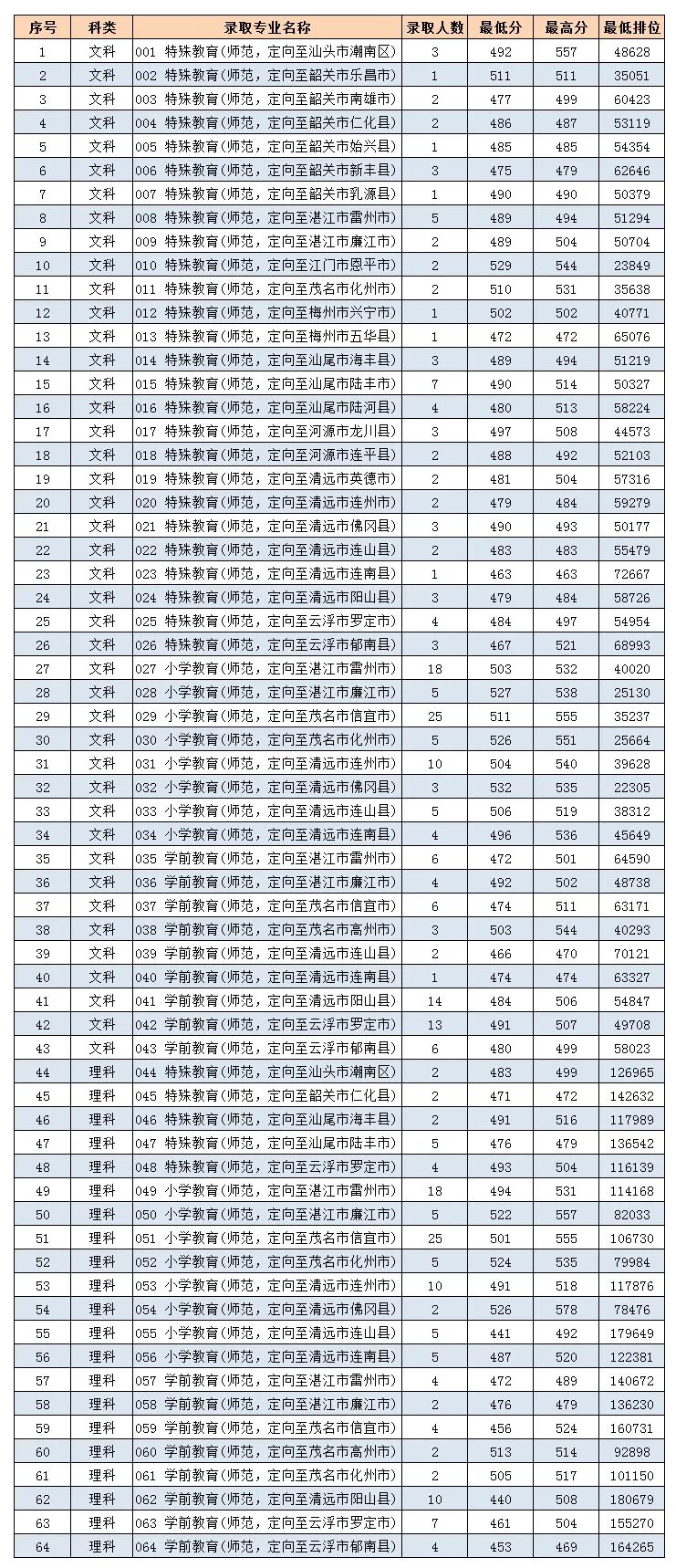 广东教师专项计划实行专业志愿优先投档,根据学校招生章程的录取原则,提前批教师专项计划文理类专业按“专业志愿优先”的原则录取,根据考生所填报专业志愿按考生投档总分排位情况从高分到低分录取。考生投档总分相同时,按照考生排位择优录取。最终文科类10人分数低录取额满退档,理科类4人分数低录取额满退档。各专业投档录取详情见下表。