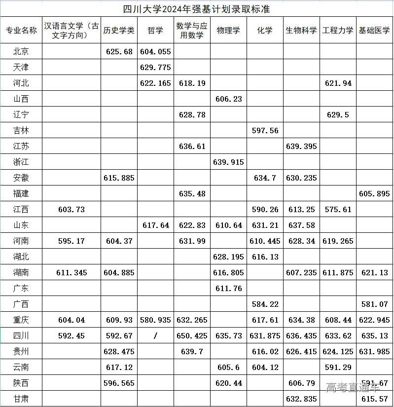 现将我校2024年强基计划录取标准公布如下,考生可登录四川大学强基计划报名平台(https://bm.chsi.com.cn/jcxkzs/sch/10610)查询本人成绩和录取结果。