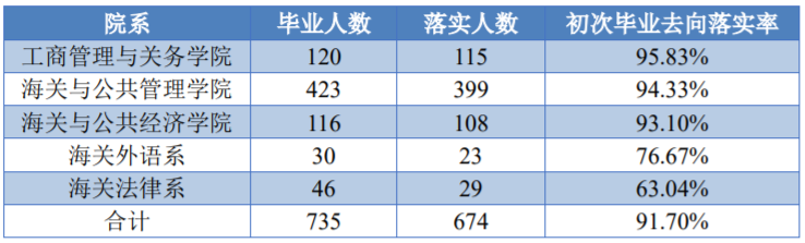 在海关总署和上海市的大力支持下,学校设立临港国际校区,推进苏州分校 建设,拓展办学物理空间,初步形成一体两翼的办学格局。学校现设有八个学院(系、部),设置了海关管理、海关检验检疫安全、海 关稽查、行政管理、物流管理、审计学、国际商务、税收学、经济统计学、法学、 英语等 11 个本科专业和公共管理、税务、国际商务、翻译 4 个专业硕士学位点。其中,海关管理专业是国家一流本科建设专业、世界海关组织 PICARD 标准认证 专业;法学、税收学专业分别是教育部第二、三批高等学校特色专业建设点;海 关检验检疫安全、海关稽查、经济统计学三个新专业于 2023 年 6 月顺利通过学 士学位专业授权审核。海关管理专业、公共管理硕士均获得世界海关组织(WCO) PICARD 标准认证资质,学校成为目前全球唯一一所本硕教育阶段均获得世界海 关组织教学资源和专业认证的高等院校。 学校设有 11 个本科专业,覆盖了管理学、经济学、法学、文学等 4 个学科 门类,首创了由海关管理、海关检验检疫安全、海关稽查三个国家控制布点特设 专业构建的海关类专业群,形成了海关特色鲜明、多学科协调发展的专业布局和 与国家战略、现代化海关和外经贸事业发展需求相适应的人才培养体系。截至 2023 年 9 月 30 日,学校全日制在校生总规模为 2890 人,其中本科生 2,751 人,本科生数占全日制在校生总数的比例为 95.19% 。2023 年,学校面向 31 个省(市、区)本科招生计划 720 人,实际录取 720 人,录取率 100%;实际报到 702 人,报到率 97.5%。2023 年共有本科毕业生 666 人,实际毕业人数 658 人,毕业率为 98.8 %。其中,657 人获授学士学位,学位授予率为 99.85%。 截至 2023 年 8 月 31 日,我校 2023 届本科生落实人数 600 人,其中国内升 学(含研究生、第二学士学位)27 人,出国(境)深造 25 名,共计 52 人继续 攻读研究生学位。初次毕业去向落实率为 91.19%,主要就业去向包括:协议就 业、合同就业、升学(国内)、出国(境)深造、其他录用形式就业、国家地方 基层项目等。从就业单位流向看,党政机关为毕业生就业主渠道,吸纳毕业生 297 人,占比 49.50%;其中共有 5 人到边关(基层党政机关)就业,占党政机关 就业毕业生总数的 1.68%。企业吸纳毕业生 133 人,占比 22.17%,其中中小企业 占企业单位吸纳毕业生的 49.25%。